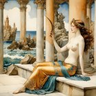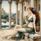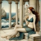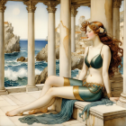 A serene woman in a vibrant turquoise outfit sits elegantly on a luxurious throne-like chair, gazing thoughtfully towards a picturesque landscape of lush greenery and ocean.