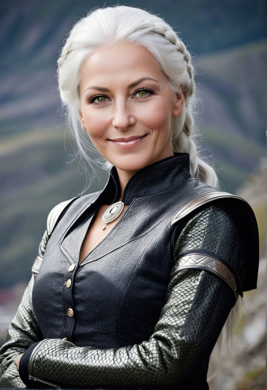 A woman with long, silvery-white hair, green eyes, and a radiant smile poses in a richly embroidered black and green outfit, set against a backdrop of lush hills.