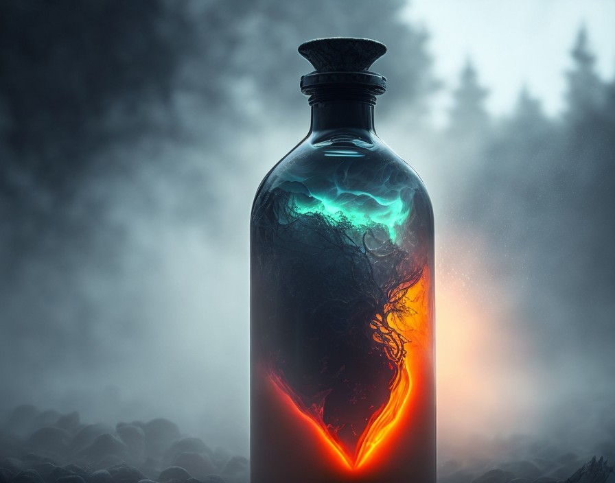 Swirling orange and teal substance in glass bottle against foggy forest backdrop
