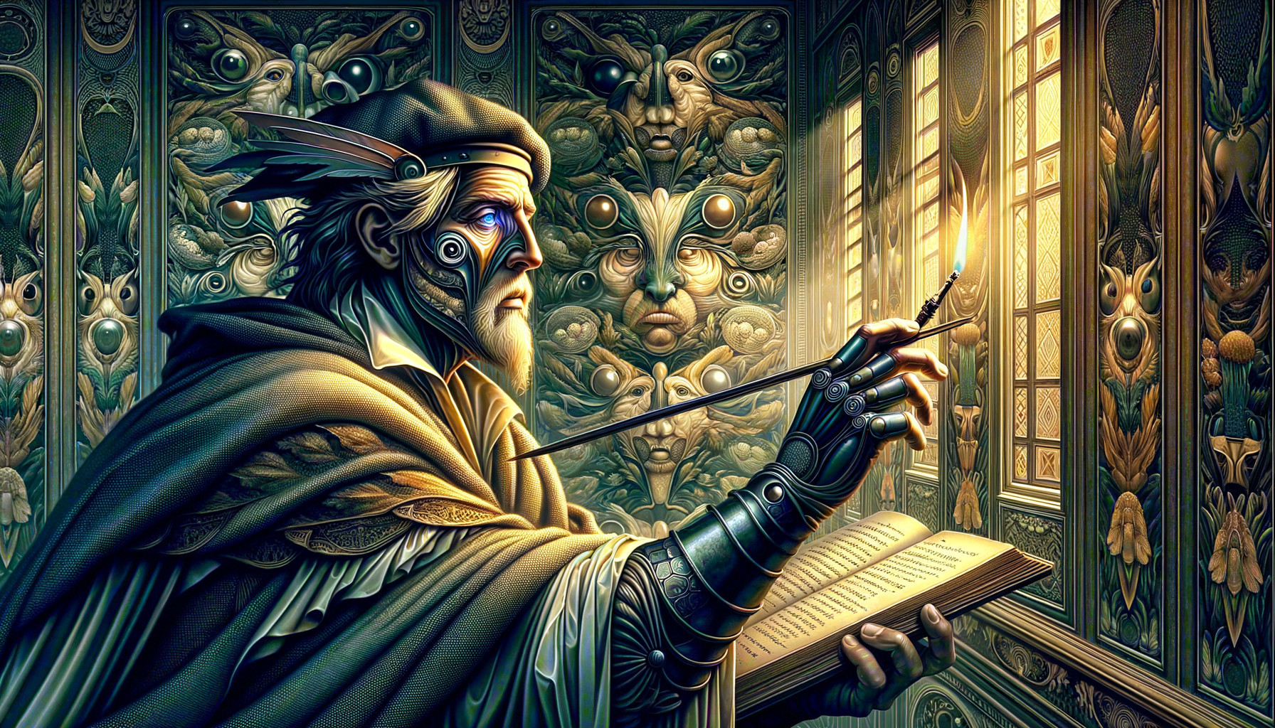 A man in historic clothing holds a candle, peering out a window, with an open book resting before him.