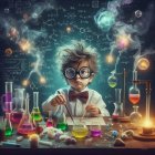 A young child with wild hair and oversized glasses conducts experiments in a colorful laboratory. Surrounded by bubbling potions and swirling smoke, they mix vibrant liquids with curiosity.