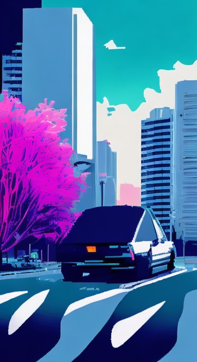 A vibrant digital art piece of an urban street scene with stylized colors, featuring a car and pink-toned trees under a blue sky.