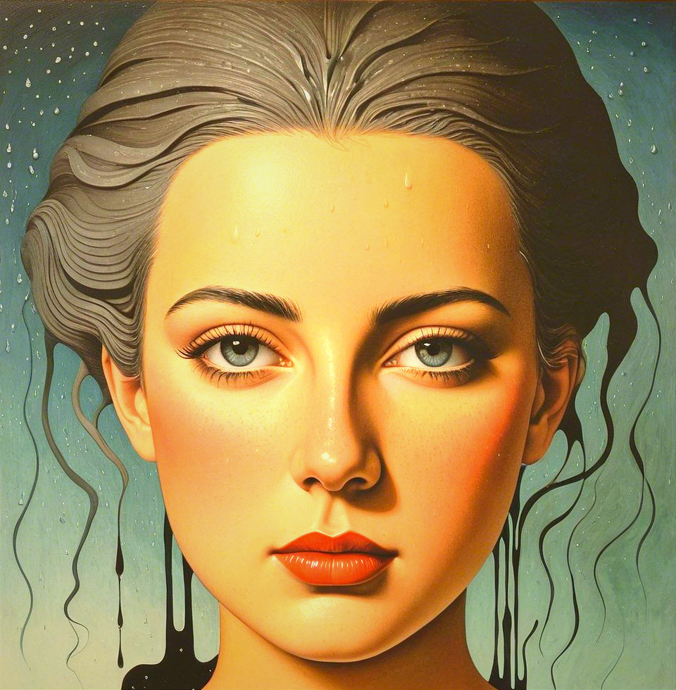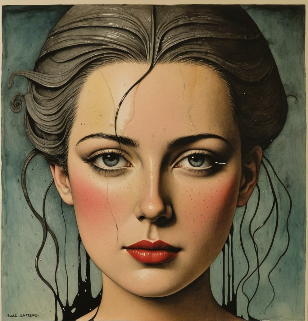 + Prompt:Prompt: wet on wet painting by saul steinberg and david mattingly, dark fantasy, surrealism, unparalleled detail, paper fibers, paint cracks, soft eroticism, inkpunk 1.3, splash ink technique, soft rounded edges, aquatint merged with aquarelle extrusion, detailed, black ink, lines, over the watercolor effects,:cartoon references, intricate, detailed, crisp quality, adorable psychedelic art, Cartoon vintage details, highly detailed, digital painting, fantasy illustration, intricate quality, revealing, sculpted, incredibly detailed, iridescence, parallax occlusion, ray-traced shadows 1.2, plasticity 1.3, complexion 1.1, custom_loss:edge, only curves, zentangle method, dynamic lighting 1.7, softened lighting, otherworldly, original, great depth and scale, earth tones, american gothic 1.7, dimmed lighting, low key lighting, divisionism, quilling, delicate coloring 1.3, sculpted, cel-shaded, somber, peculiar, Ethereal, woman's face, Arcane GTNR style, watercolor and ink style, patchwork, uhd, hdr,VFX-inspired, precise Gelsculpt 64K, novelty architecture, dethereal,crisp quality, layered paper texture, vibrant hues, dripped and peeling paint, softened reds, tranquil green, emerald greens, emotional, 3 layers of dof, transformation, piercing eyes gaze, mood, joyful dreamlike watercolor, patterned geometric lines, line-art, HD quality, reminiscent of 1980s european comic book art, brightness 1.4, overall composition by Katsuhiro Otomo,