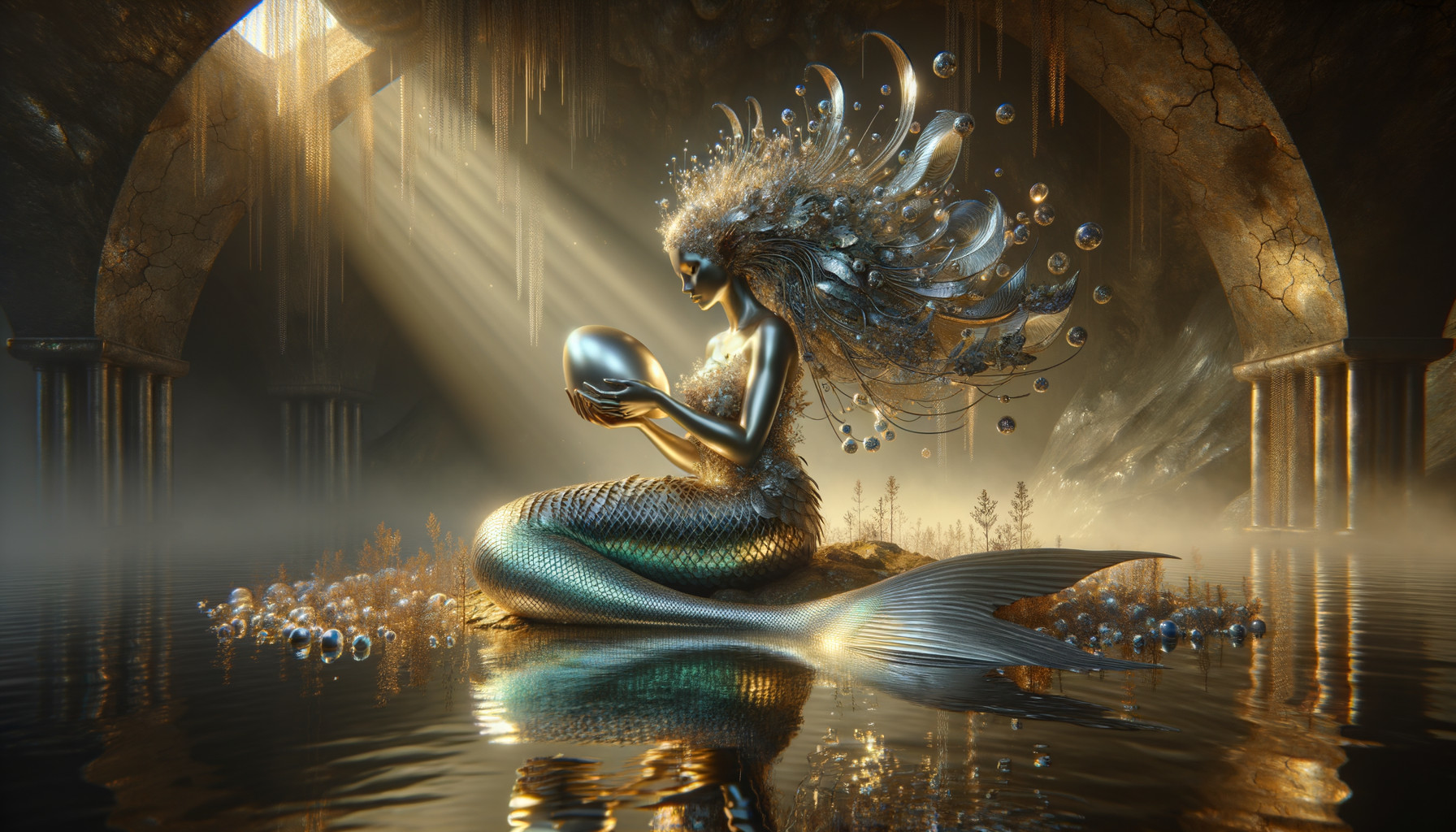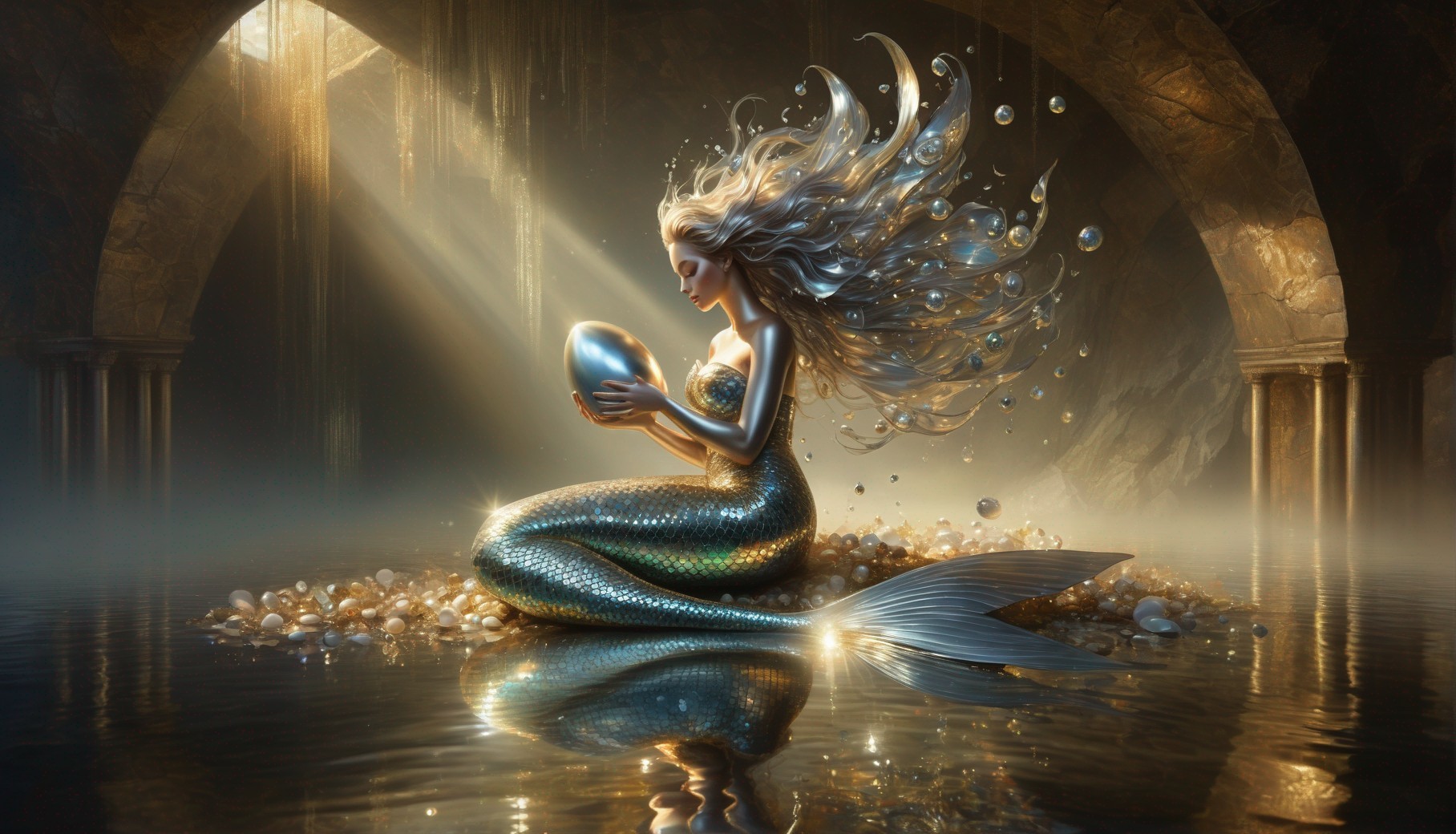 A mermaid with flowing hair sits under an archway, holding a glowing orb amidst sparkling water.