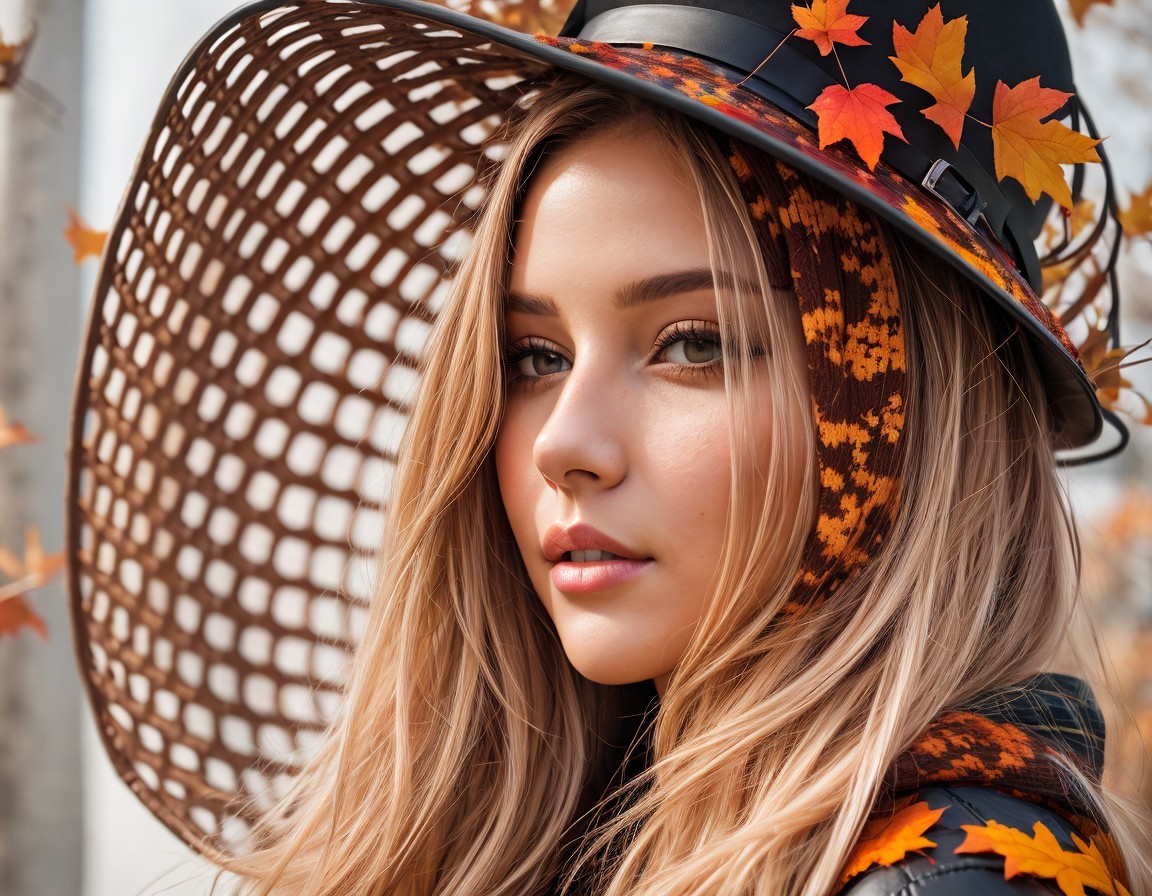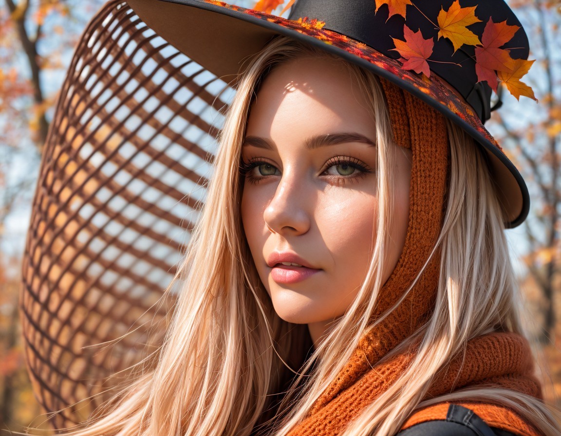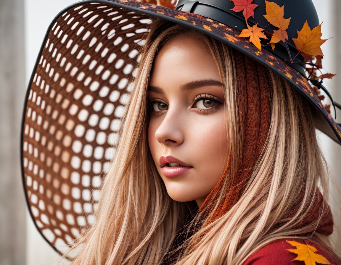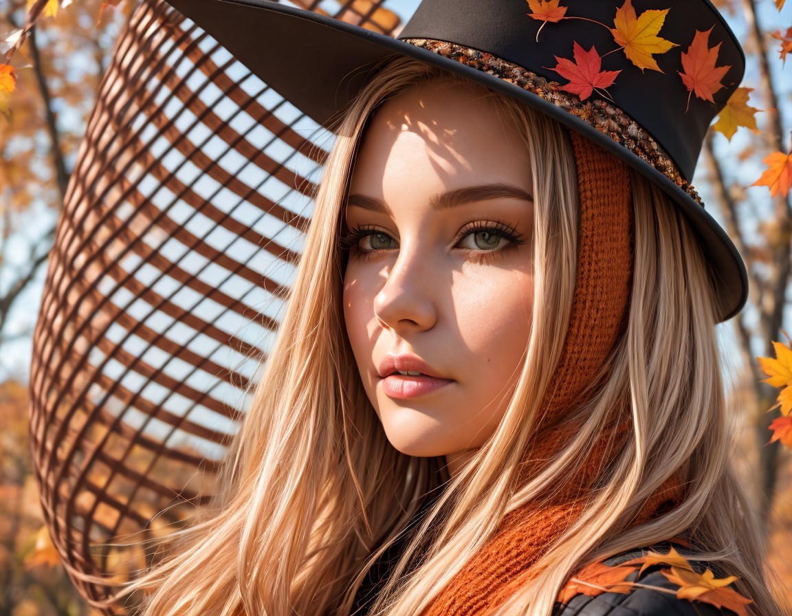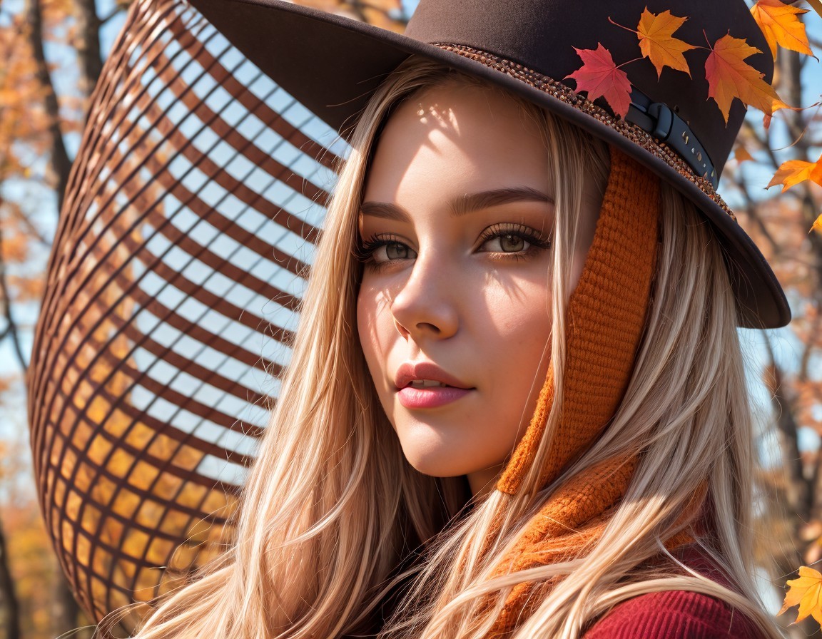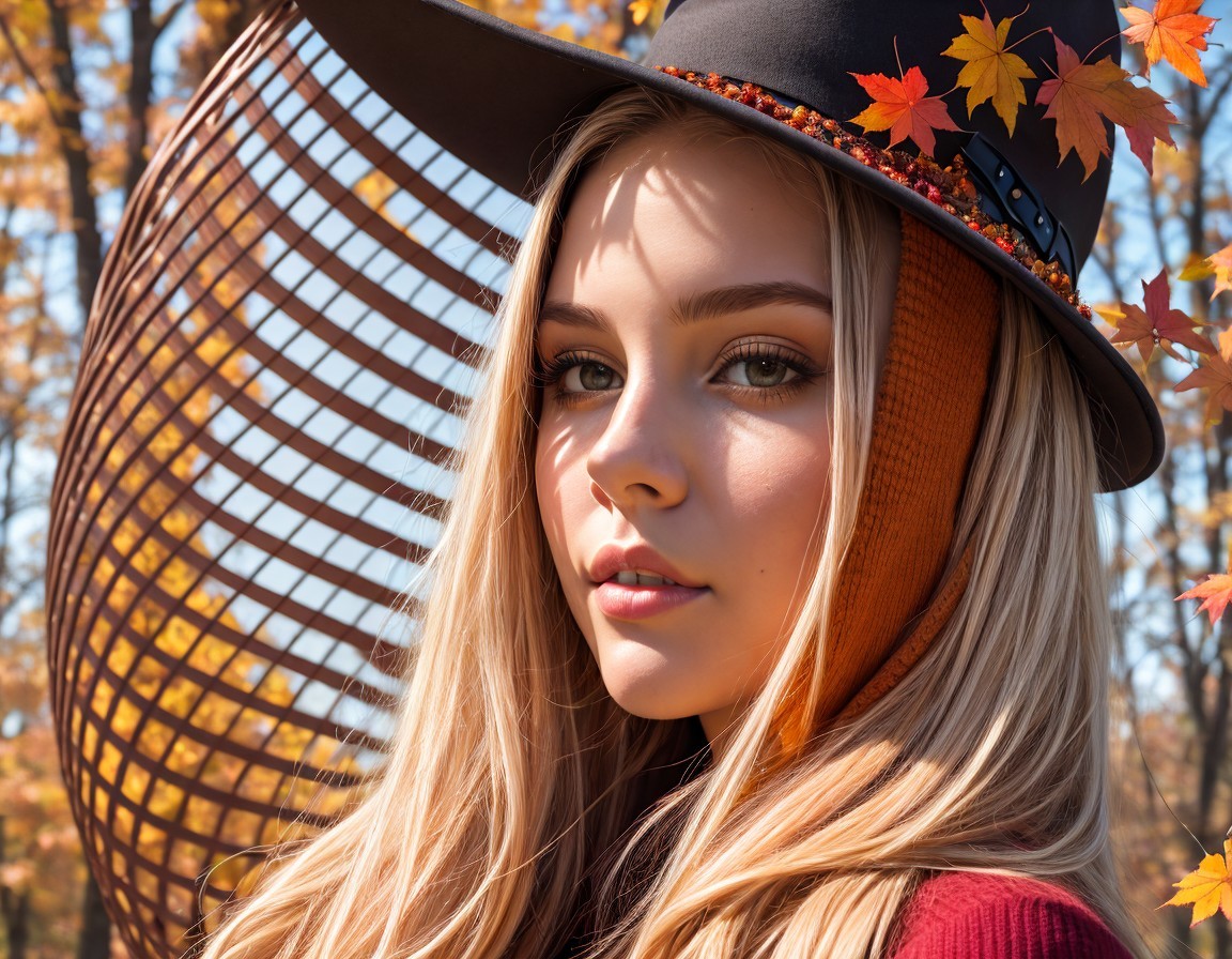 A young woman with long blonde hair poses in a wide-brimmed hat, framed by vibrant autumn leaves against a clear blue sky, exuding a warm, serene vibe.