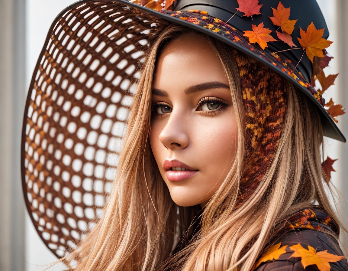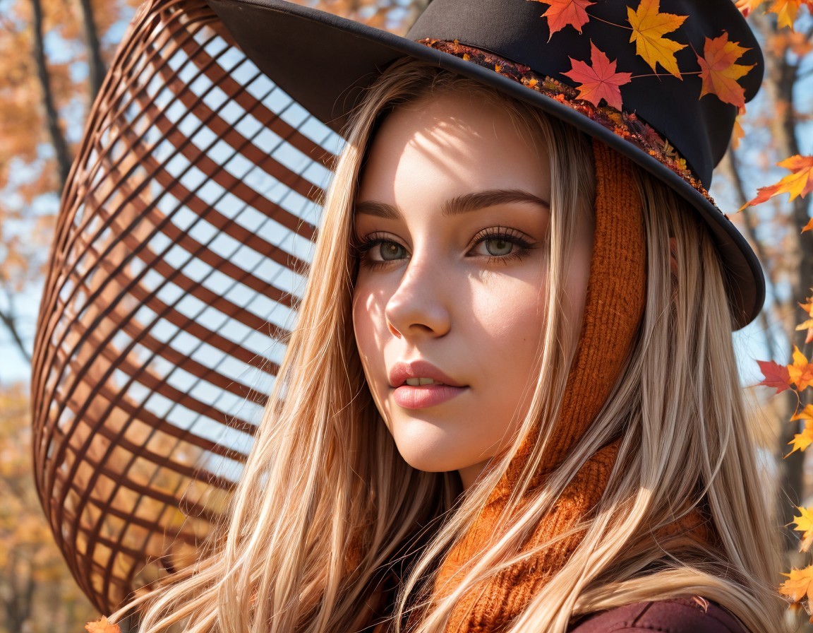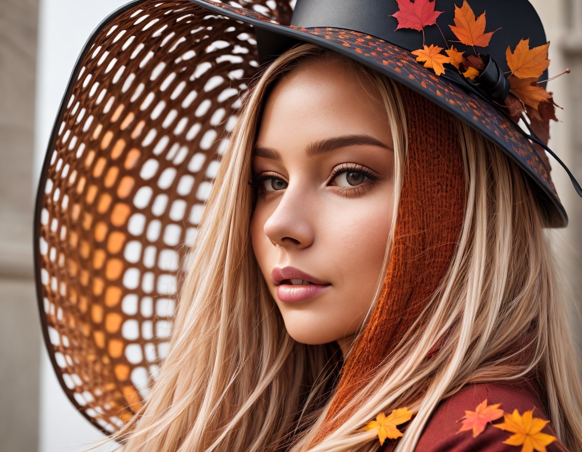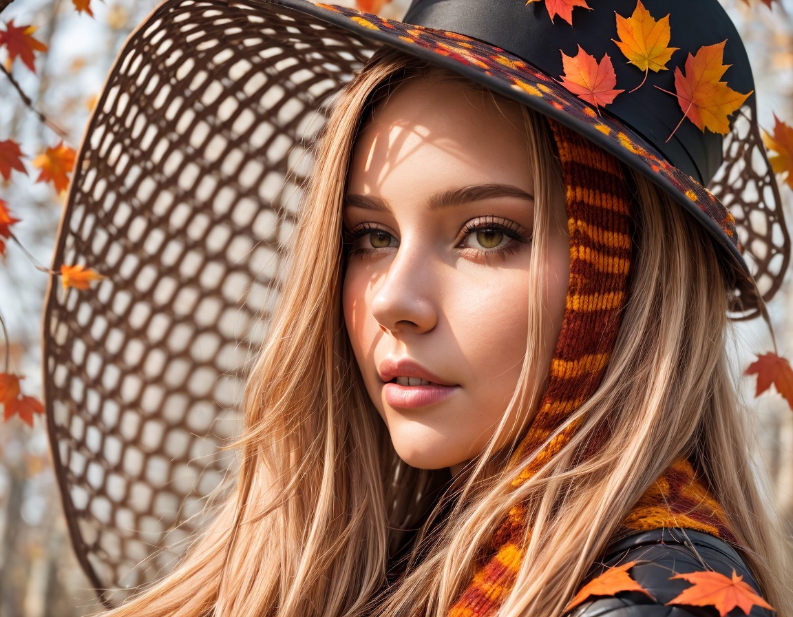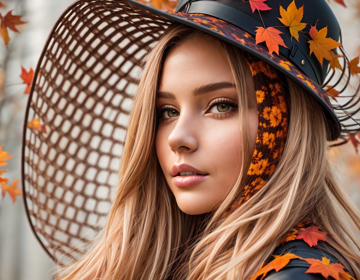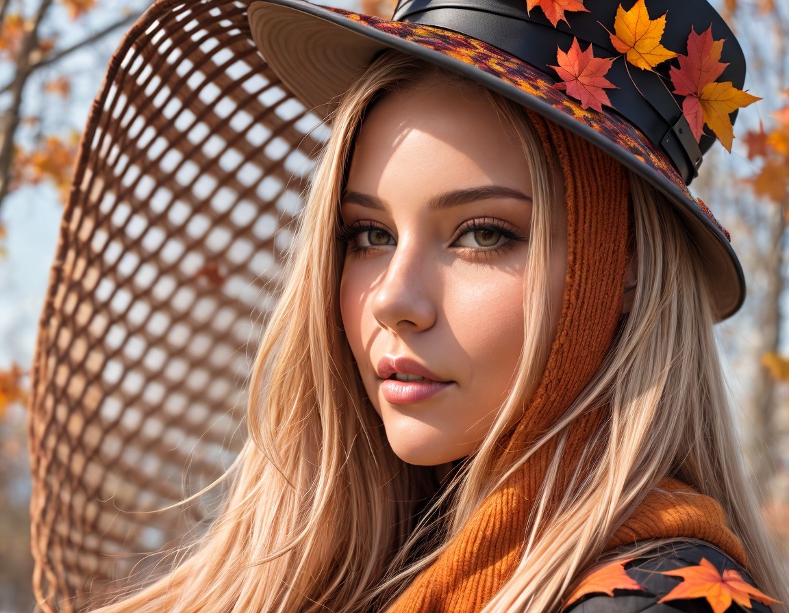 A young woman with long blonde hair poses in a wide-brimmed hat, framed by vibrant autumn leaves against a clear blue sky, exuding a warm, serene vibe.