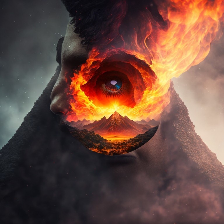 A surreal image with a giant eye merged into a volcanic mountain landscape, with a fiery glow and mist surrounding the base.