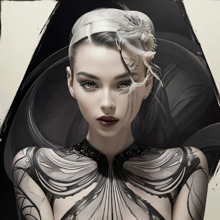 Prompt: Create a stunning 3D artwork featuring a beautiful serene woman in a futuristic take on 1950’s retro-vogue and punk fashion. The depiction includes the entire body, with precise and intricate designs created using charcoal and pastels and a rich oil-paint palette of imperial colours. The artwork showcases various techniques such as line art, colour glazing, and multiple textures, with an extremely detailed carnival background. The subject’s outline blends into the background, embellishments, etherial designs, and billowing hair. The composition is part pigmented paints and part charcoal sketching and pastel drawing, creating a mesmerisingly intriguing and unique hyper-resolution image. The overall image is sophisticated and colourful, with perfect body proportions, and consistent design aesthetics, by Paul Cadden, Paul Cadmus, Richard Burlet, Vasyl Khodakivskyi