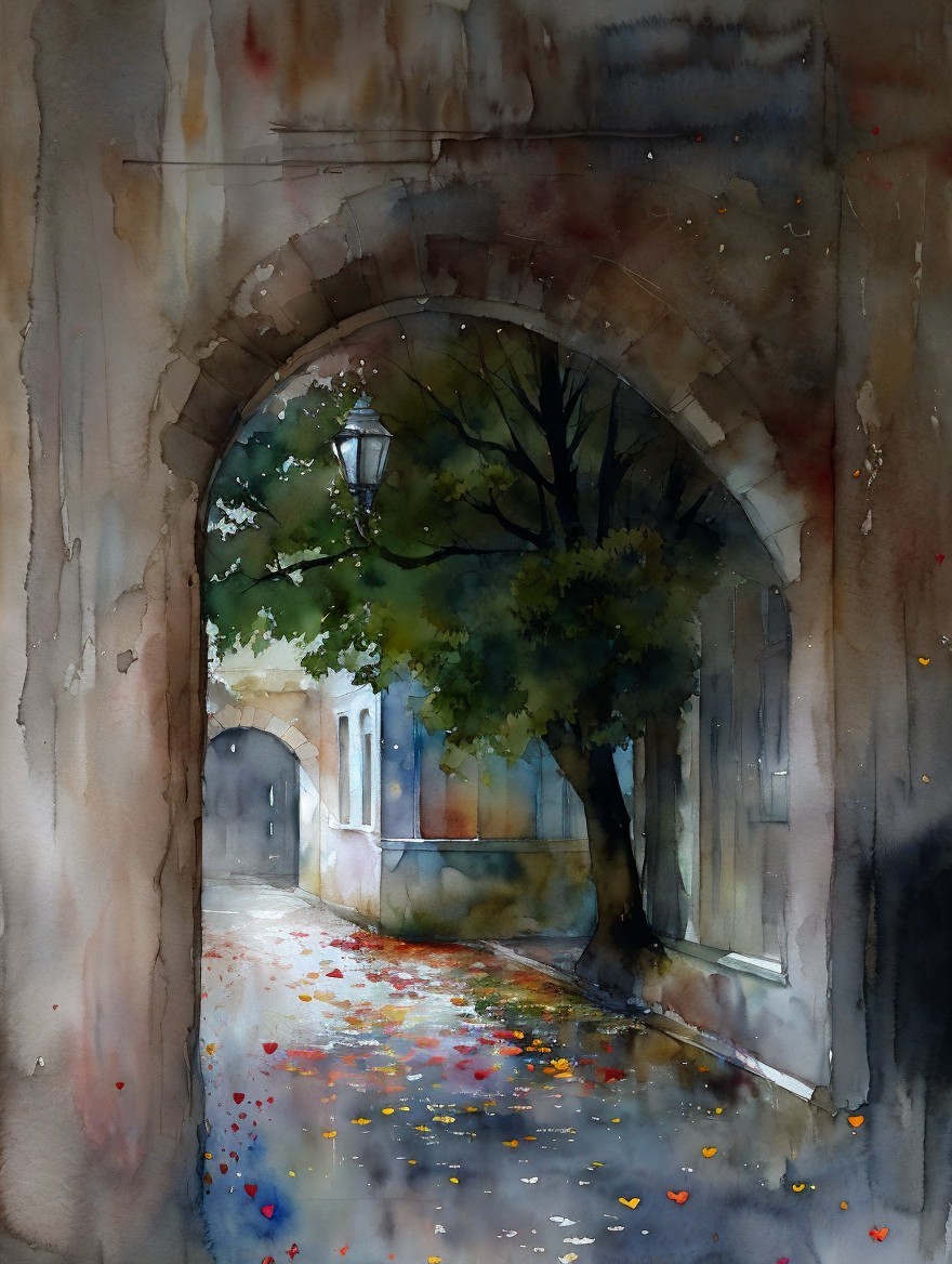 A person walks down a colorful, dimly-lit cobblestone street in a watercolor painting, flanked by quaint buildings and a streetlamp.From my own image.