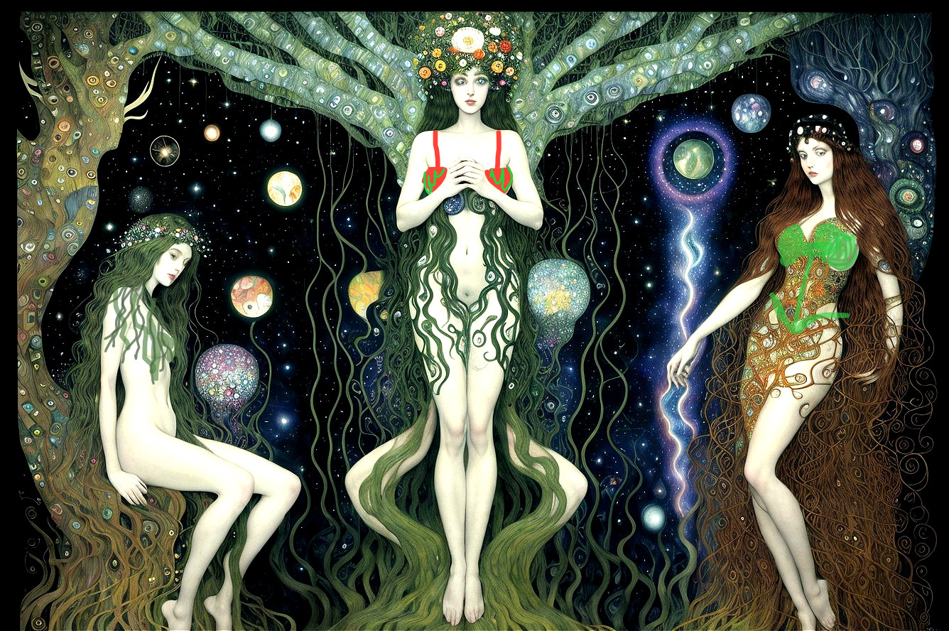Three ethereal women amidst a mystical, star-lit forest with glowing orbs and an intricate tree.