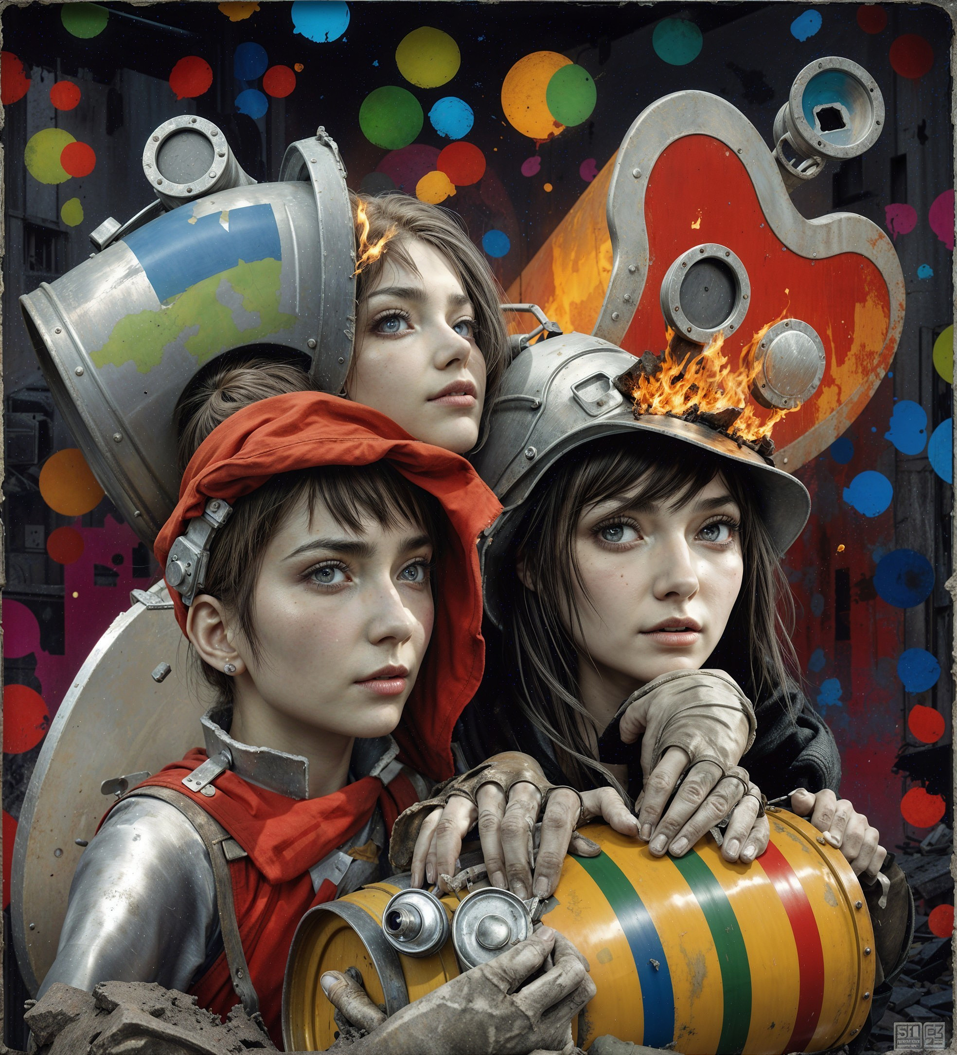 Three young women with distinctive hairstyles and colorful helmets stand together. One holds a striped barrel, surrounded by a vibrant backdrop of polka dots, creating a playful yet dynamic scene.