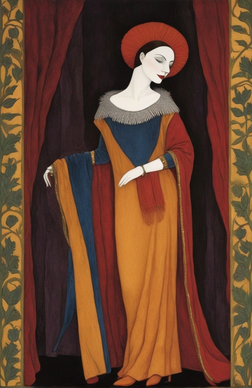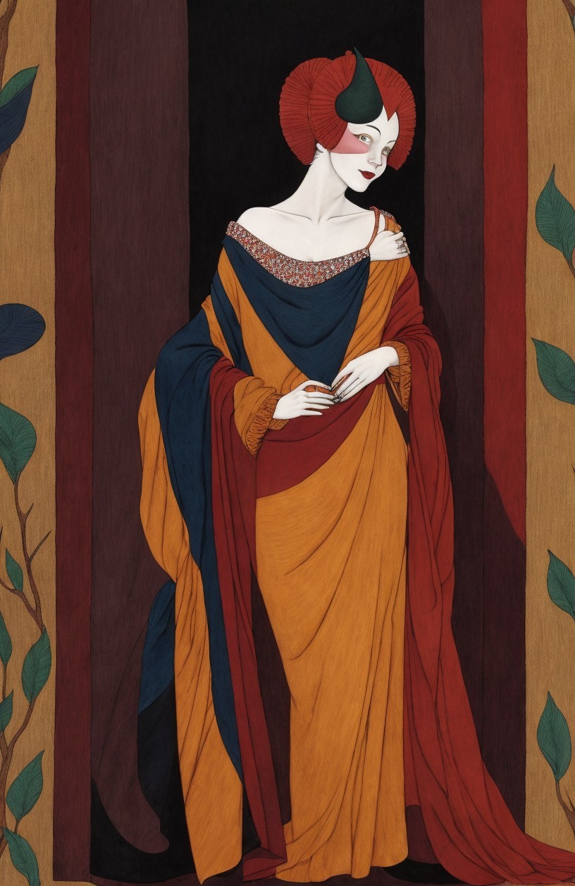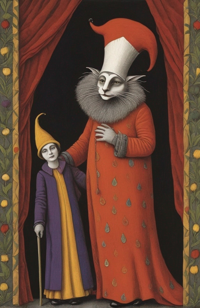 An illustration of a court jester with a lemur's face, wearing a red outfit, standing beside a small creature in a pointed hat.