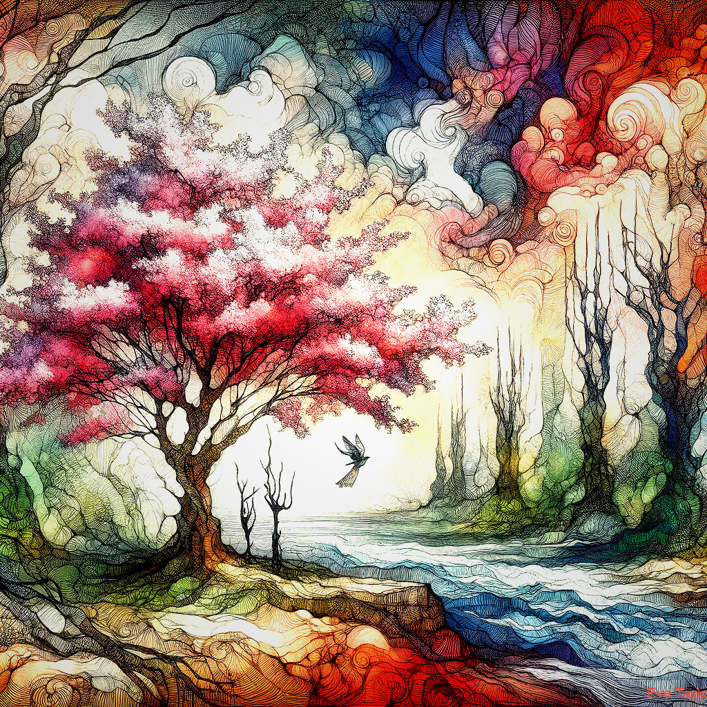 Prompt: The spectral world. More detail with pen; trees, protagonists, other salient details. Spring at my fingertips. The stirring bud of hope, of desire, of change. The river in spate. The redbud.