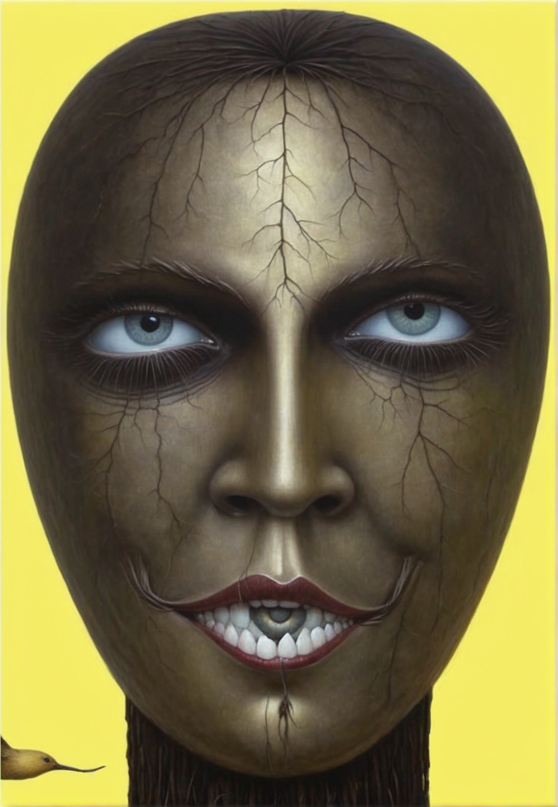 A painting of a figure with a pumpkin head, dressed in antique clothes, holding a teacup, with birds perched on its shoulders against a yellow backdrop.