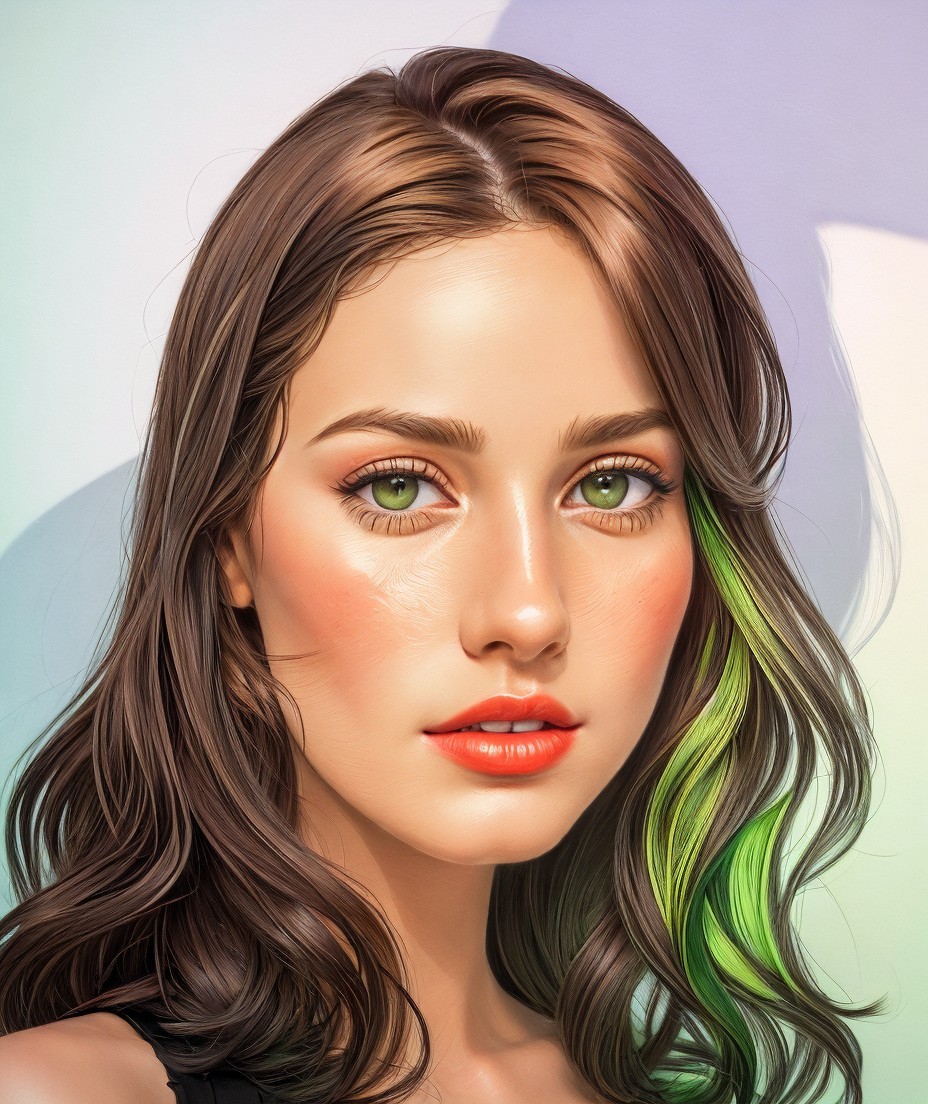 A digital portrait of a woman with brown hair, green highlights, and striking features against a pastel background.