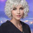 A woman with elegant, curly white hair gazes thoughtfully. She wears a black outfit with gold buttons, her makeup is striking, set against a serene coastal background and bright sun.