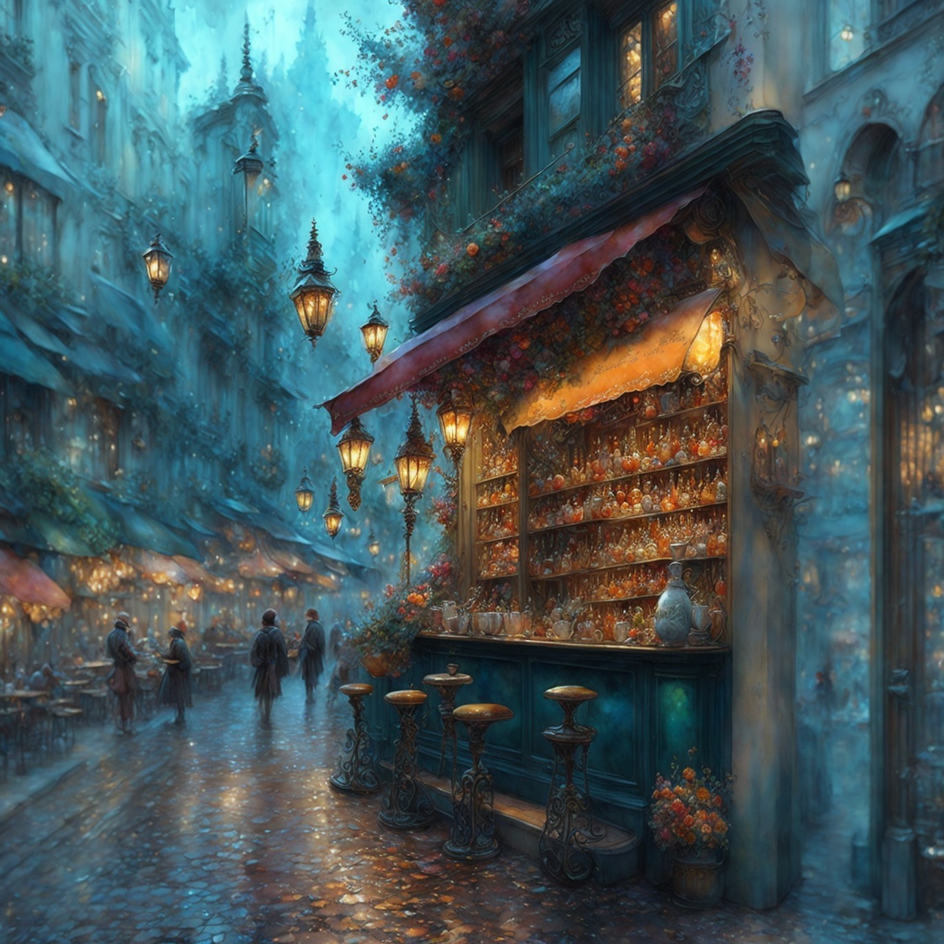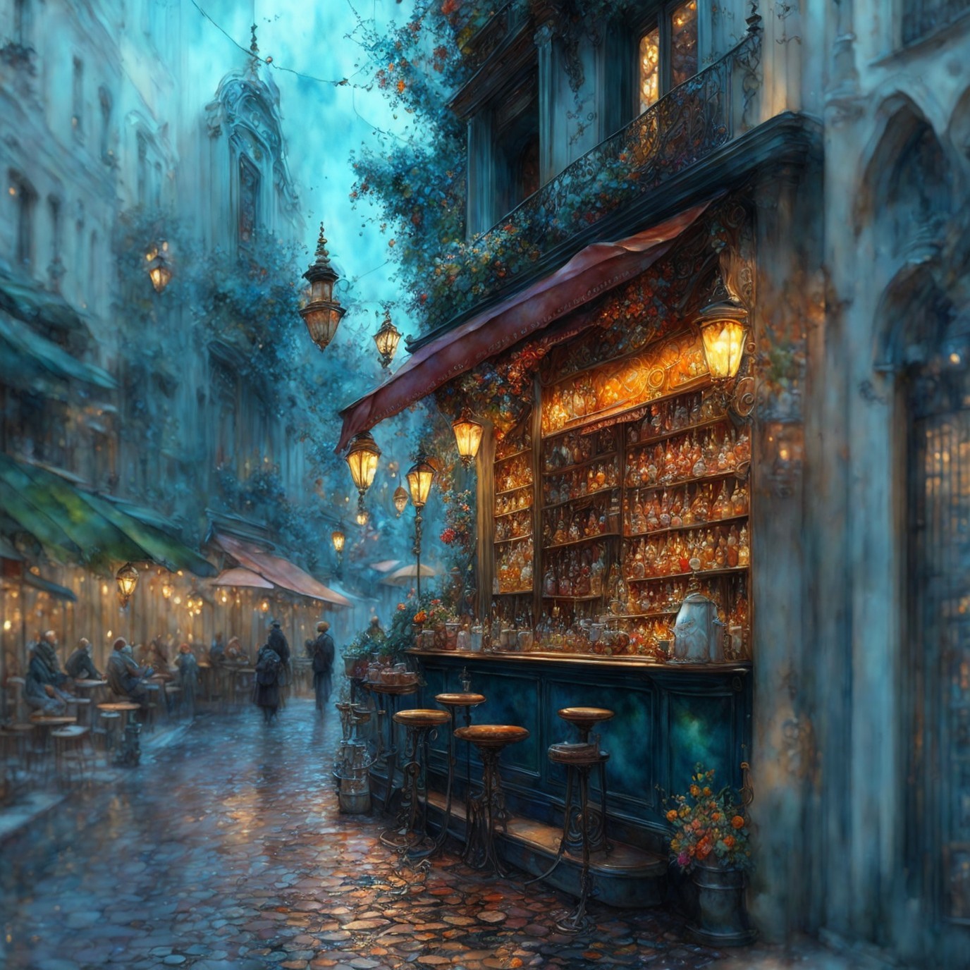 A charming European street corner at dusk, with quaint buildings adorned with glowing lights and lush, green plants.