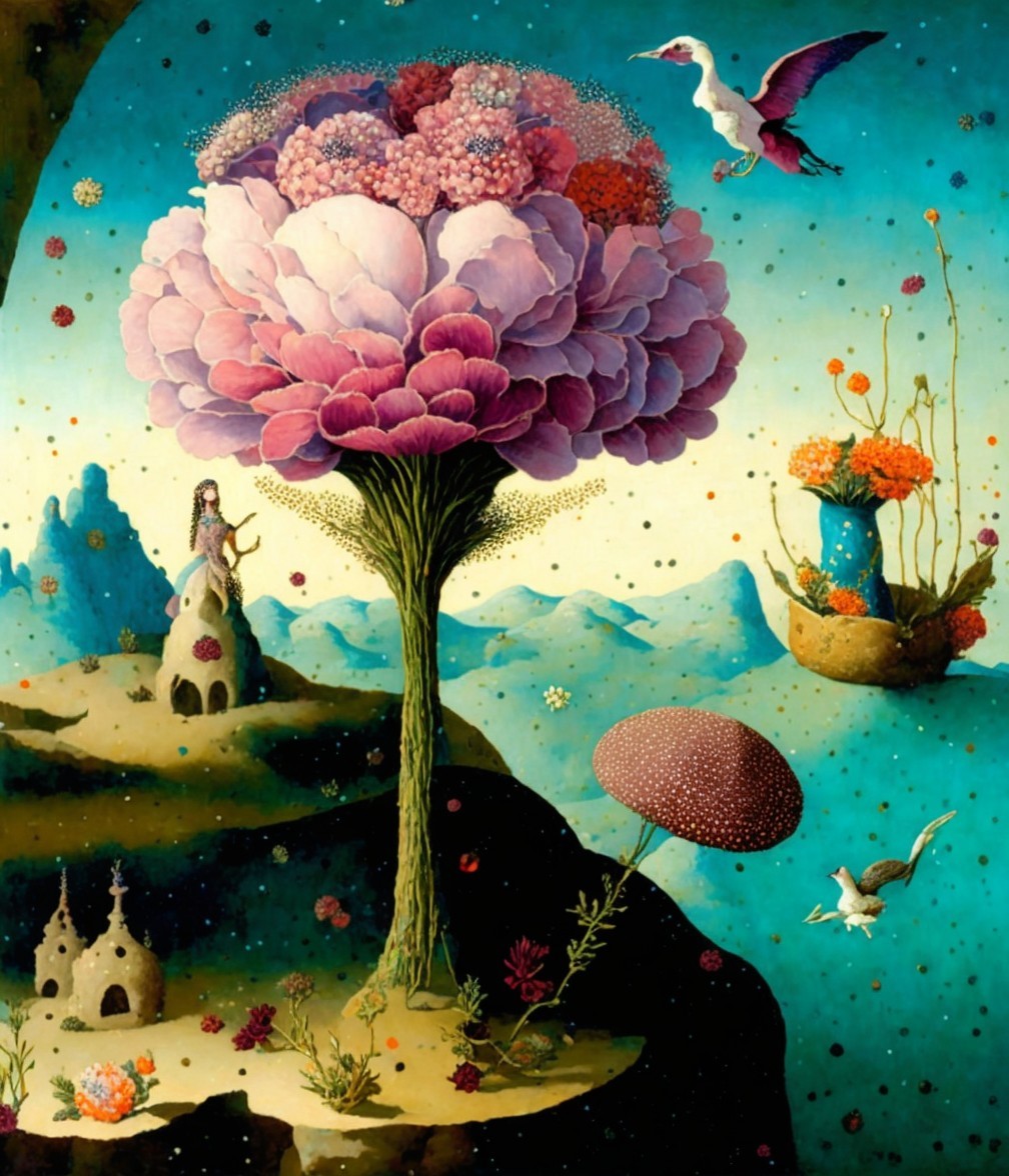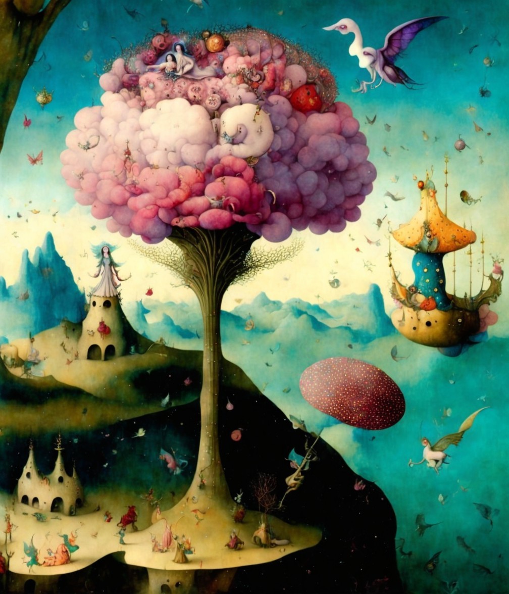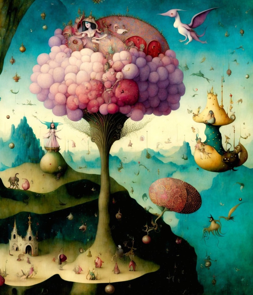 A surreal, fantastical painting inspired by Hieronymous Bosch, featuring a giant, bulbous, pink-purple mushroom or fruit-like structure dominating the center, sprouting from a twisted, dark tree trunk with delicate branches. Figures are seen peeking from circular windows and perched around its edges.