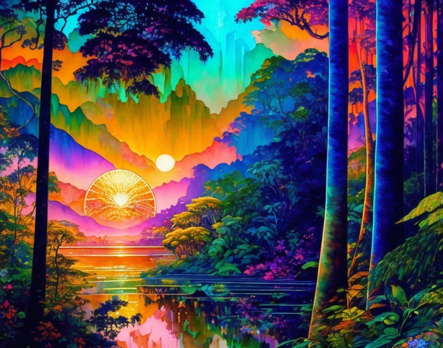 Colorful Sunset Reflecting on Serene River in Tropical Forest
