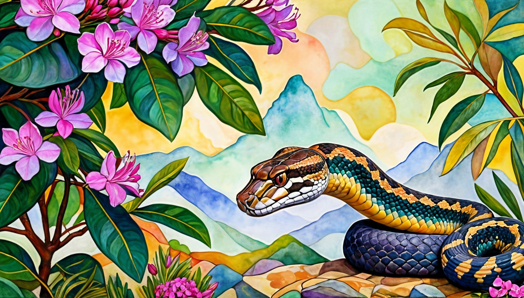 Vibrant Watercolor of Snake Among Flowers and Mountains