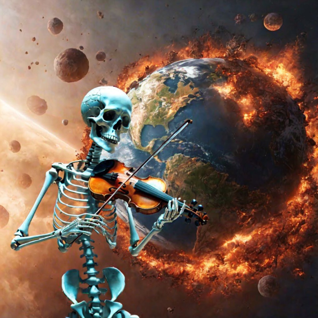 Skeleton Playing Violin in Cosmic Setting with Planets