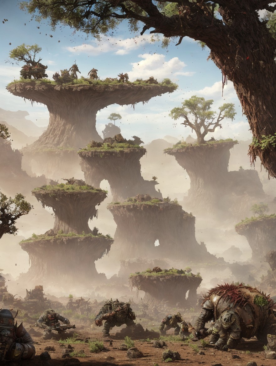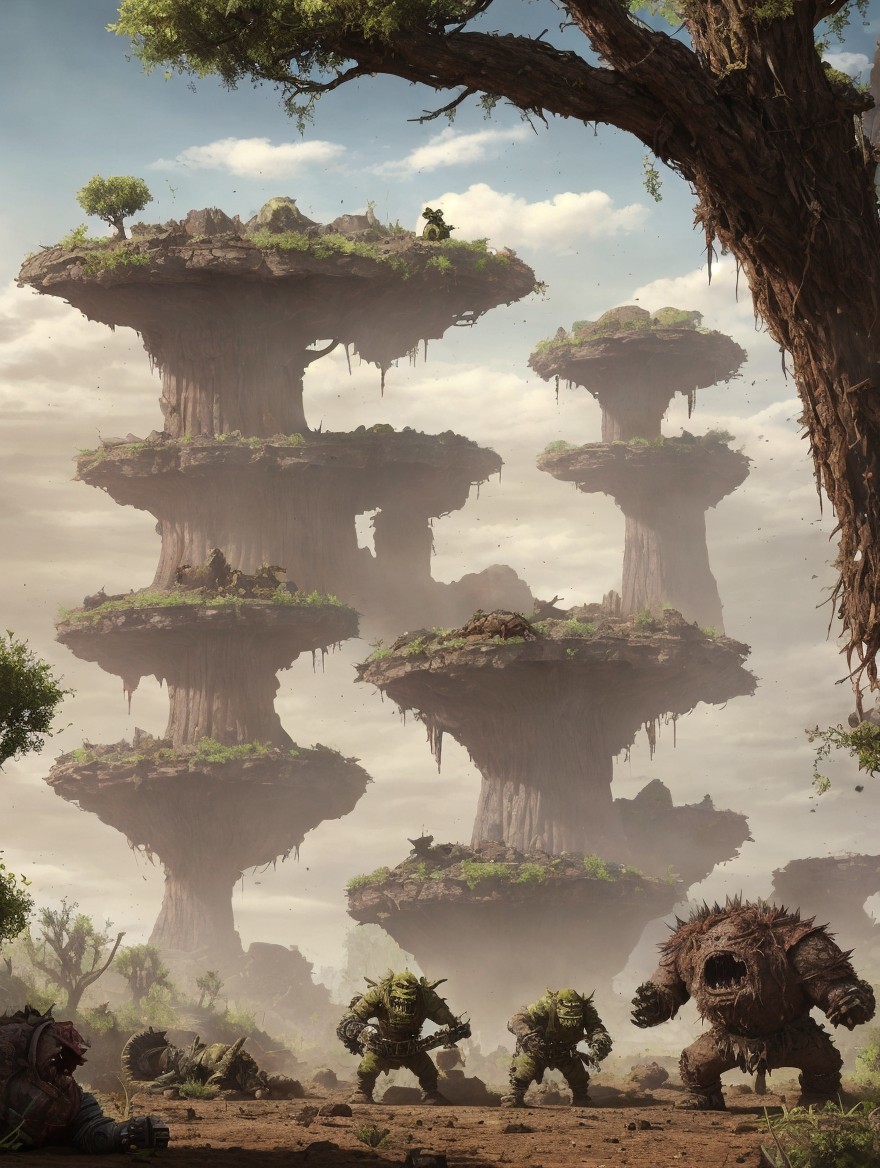 Fantasy landscape with towering mushroom-shaped rock formations, vegetation, and creatures resembling orcs and a large furry beast.
