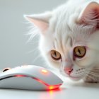 Fluffy White Cat Observes Modern Gaming Mouse