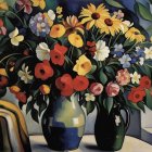 A vibrant painting featuring two cats resting beside colorful flowers in vases. The artwork showcases bold colors and geometric shapes, creating a lively, cheerful atmosphere.