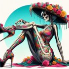 A vibrant and playful scene features a glamorous figure in a colorful bikini, posed beneath a bright umbrella, surrounded by candy-like elements, evoking a fun, summery vibe.