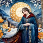 A vibrant, stylized bird stands prominently against a colorful landscape. Surrounding it are whimsical trees, flowers, and a serene sun, creating a dreamy, nature-inspired scene.