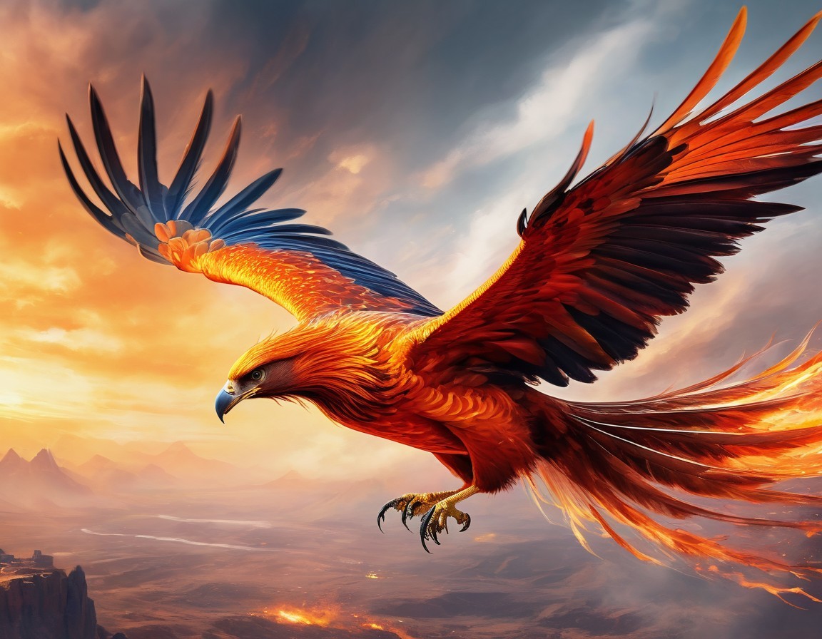 A majestic Phoenix, with fiery wings soars across a dramatic sky with orange clouds, embodying power and freedom.