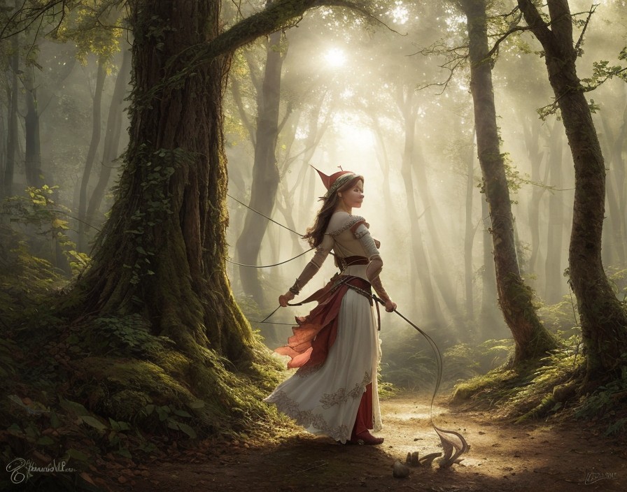A woman dressed as a Red Riding Hood archetype, wielding a bow, stands in a misty, sunlight-dappled forest, exuding a fantasy ambiance.