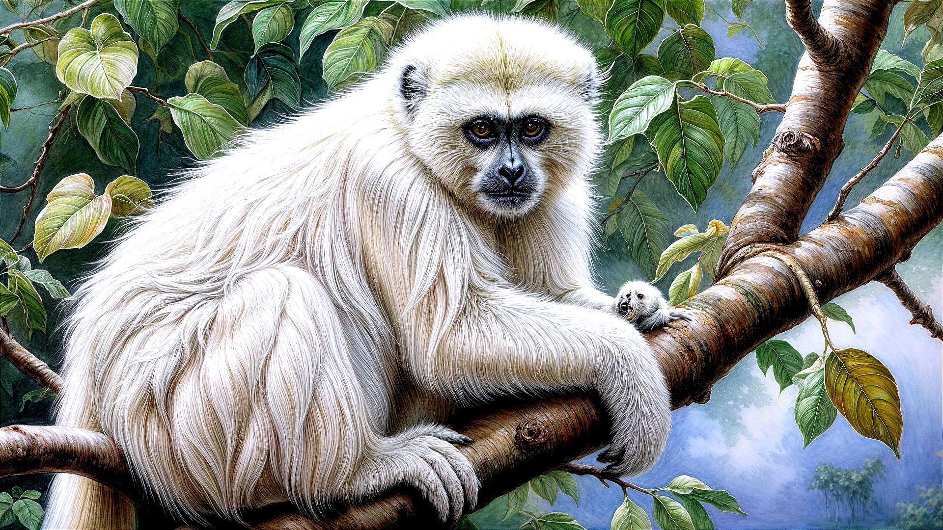 This captivating oil painting showcases a pastel white gibbon perched on a tree, featuring intricate details and vibrant colors. Thick paint layers add depth, blending various artistic influences in a stunning masterpiece.