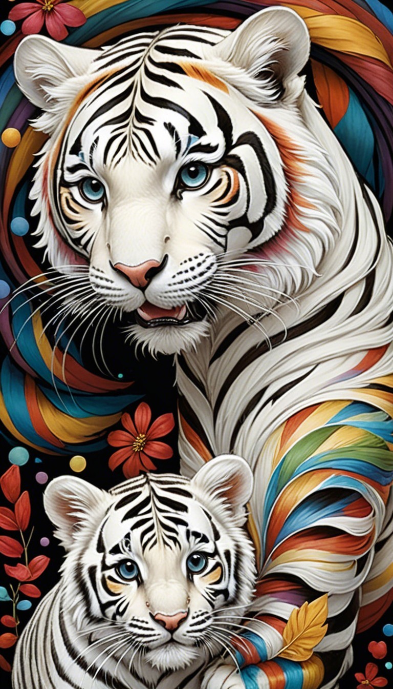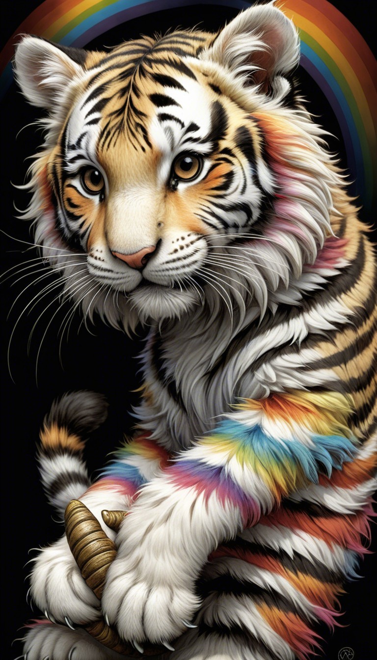 A cute, colorful tiger cub with a fluffy coat features vibrant rainbow stripes. It playfully poses on a log, exuding a joyful expression and a sense of adventure.