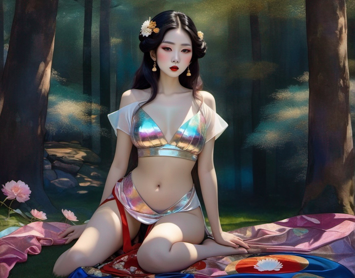 An illustrated woman with Asian features rests in a mystical forest setting, adorned with gold accents and surrounded by glowing orbs(.Inspired by Fearless Leader's Jade Geisha+ modified prompt and starting image)