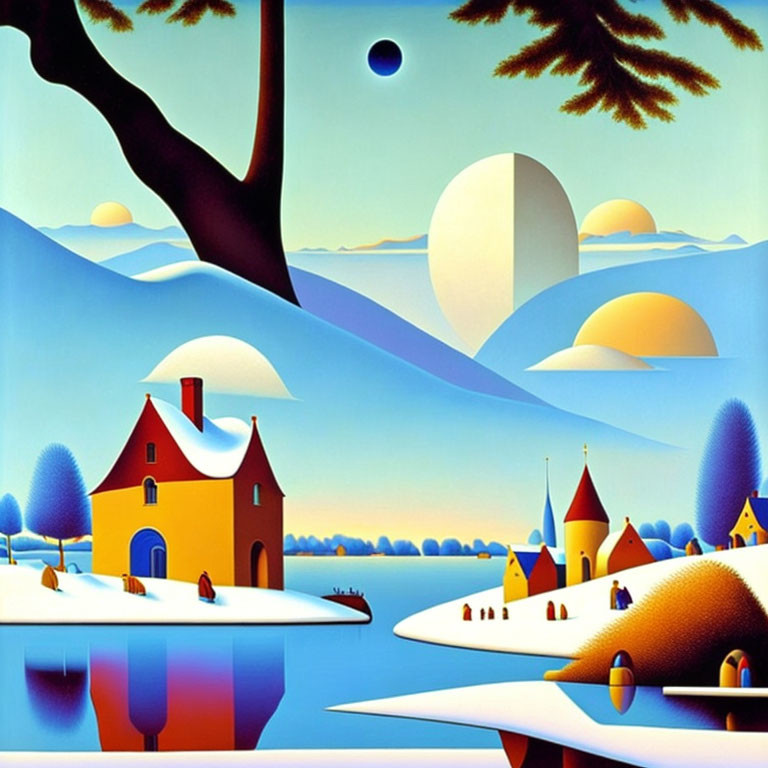 Winter landscape with red house, people, boats, trees, and church under blue sky.