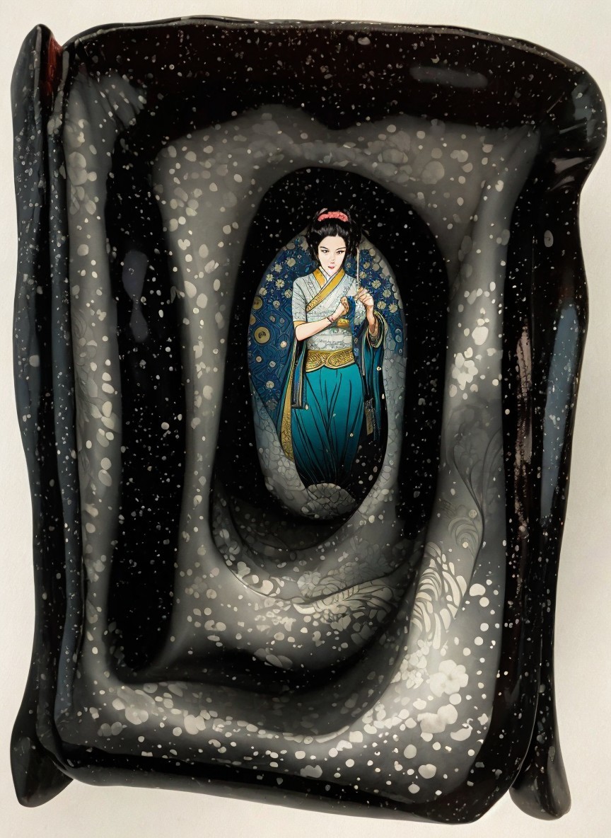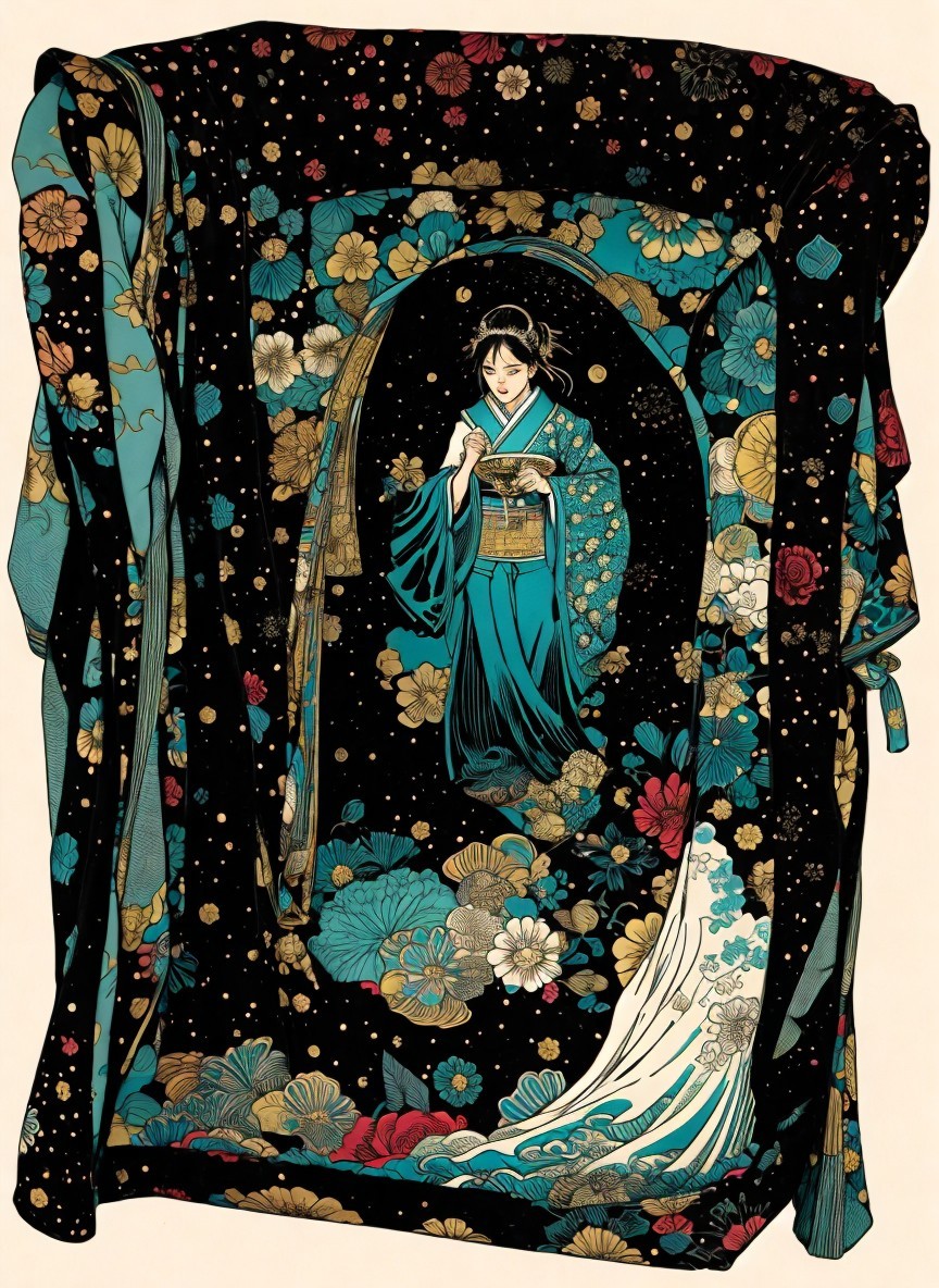 An elegant fabric with a floral and wave design in hues of blue, black, and gold, draped gracefully with a sense of movement.