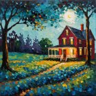 A tranquil lakeside scene features a cozy wooden house illuminated by warm light, surrounded by serene waters and silhouetted trees under a starry sky with a bright full moon. Two boats rest nearby.