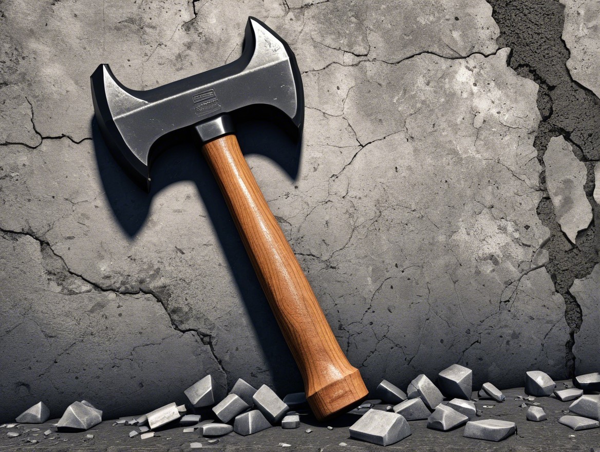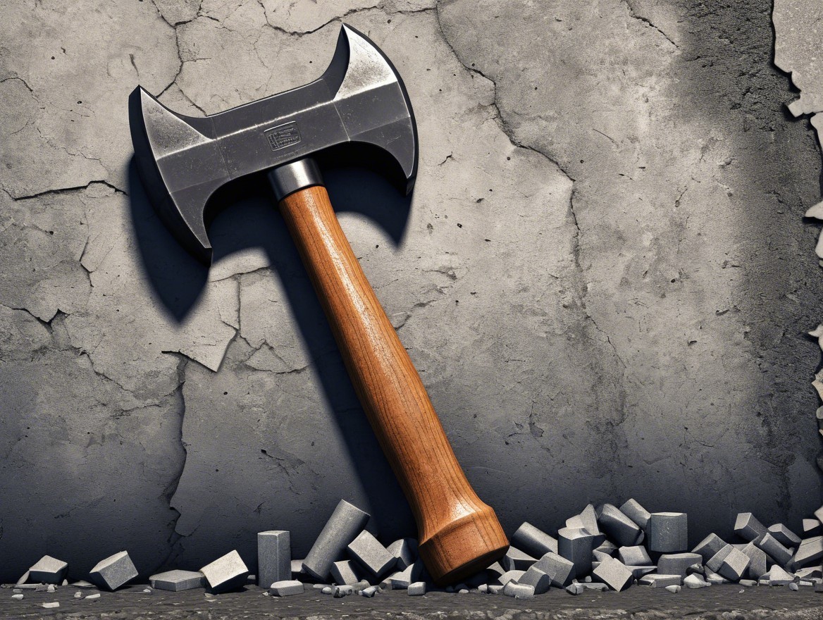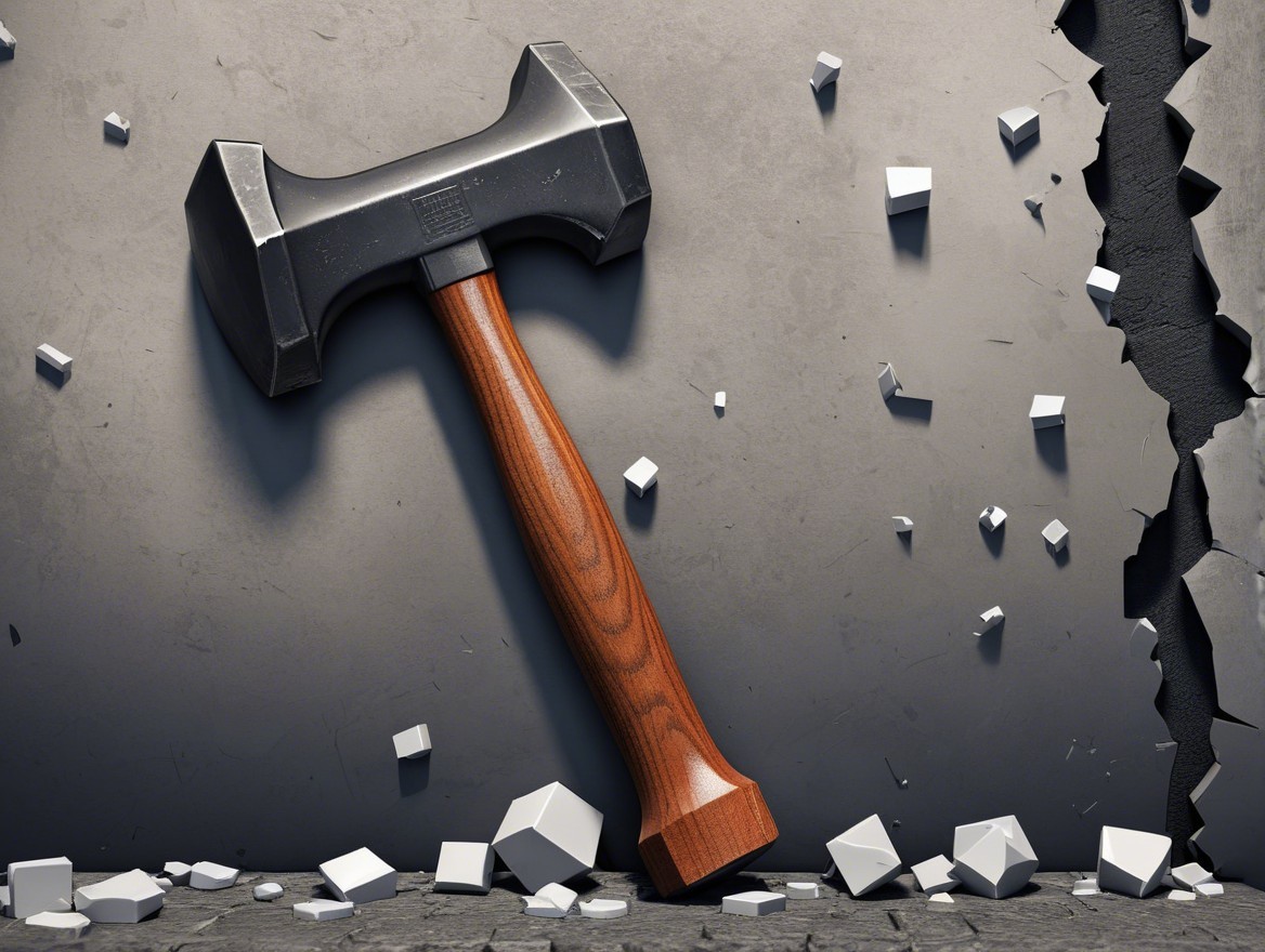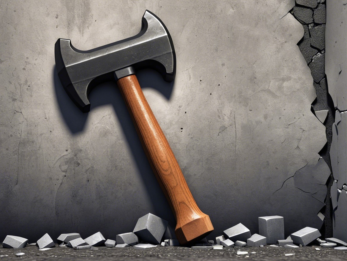 A large black sledgehammer with a wooden handle rests against a cracked wall, surrounded by shattered white cubes, emphasizing strength and impact.