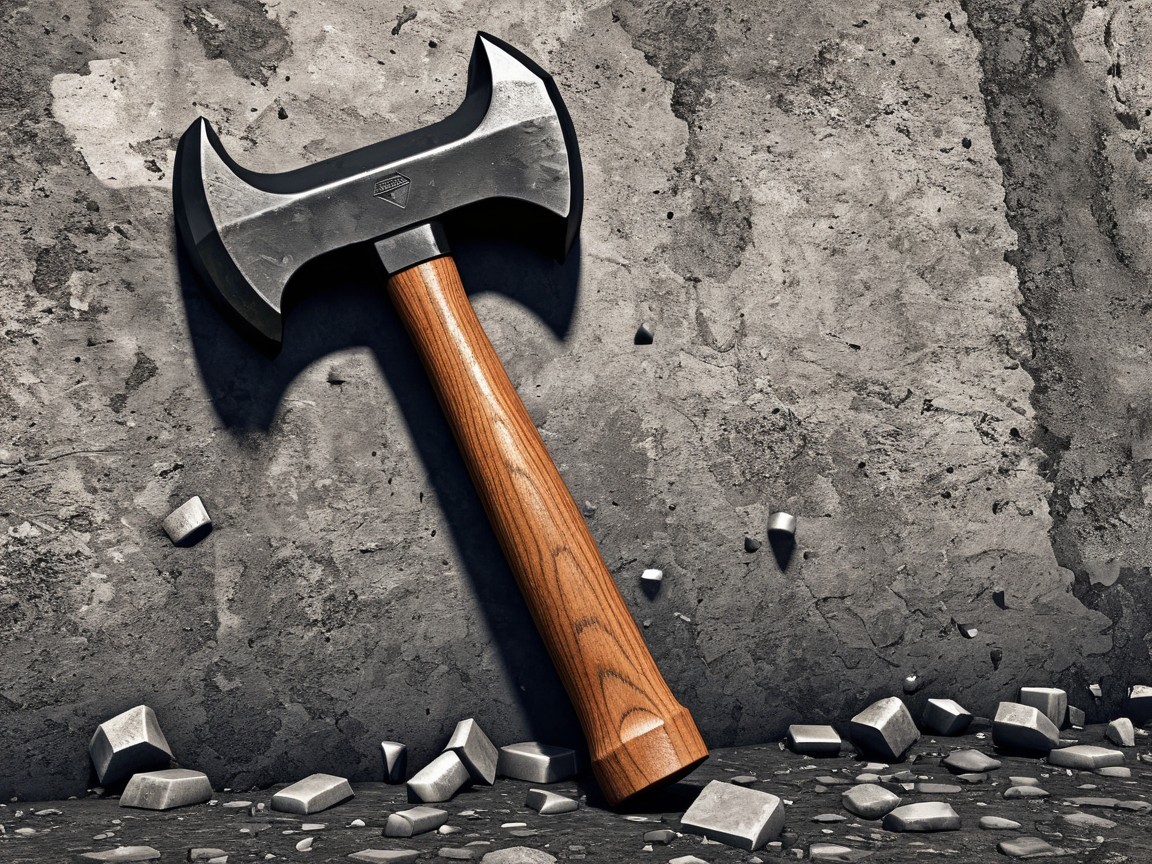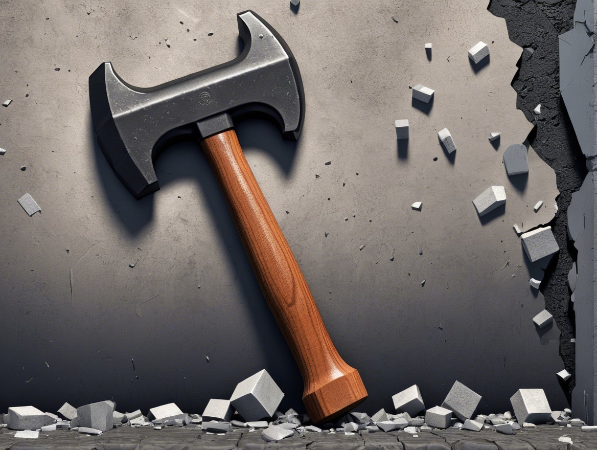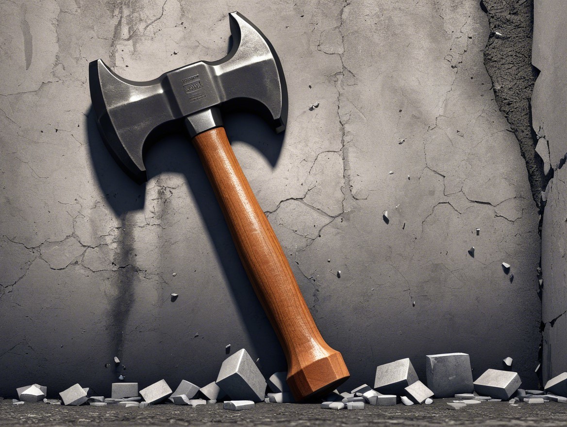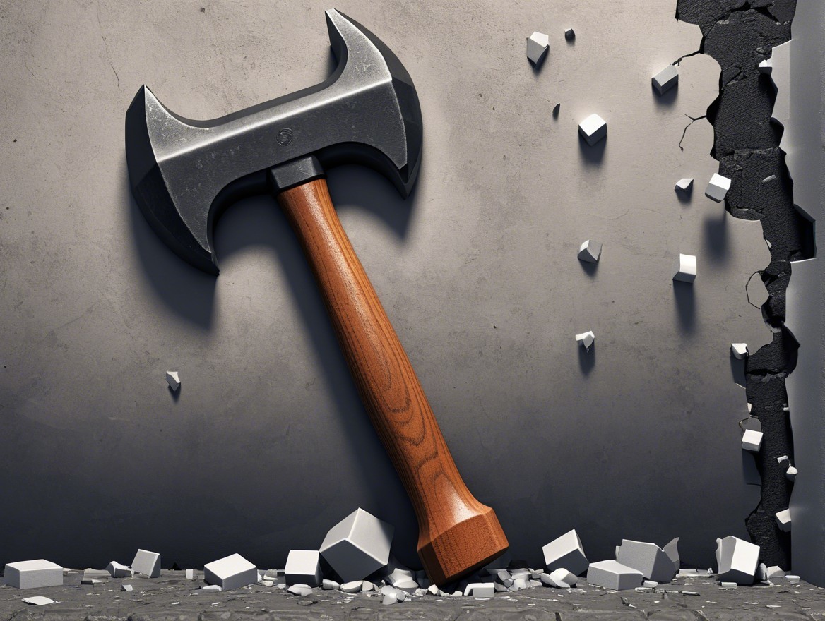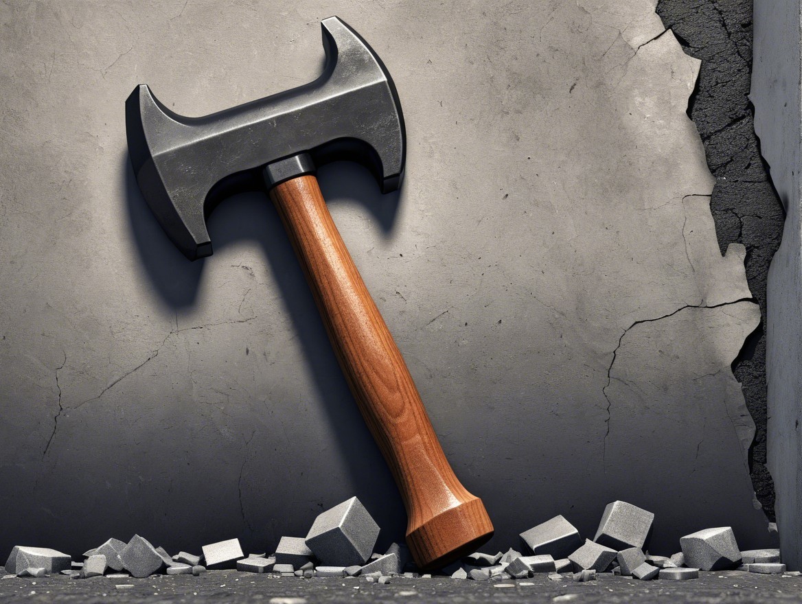 A large black sledgehammer with a wooden handle rests against a cracked wall, surrounded by shattered white cubes, emphasizing strength and impact.