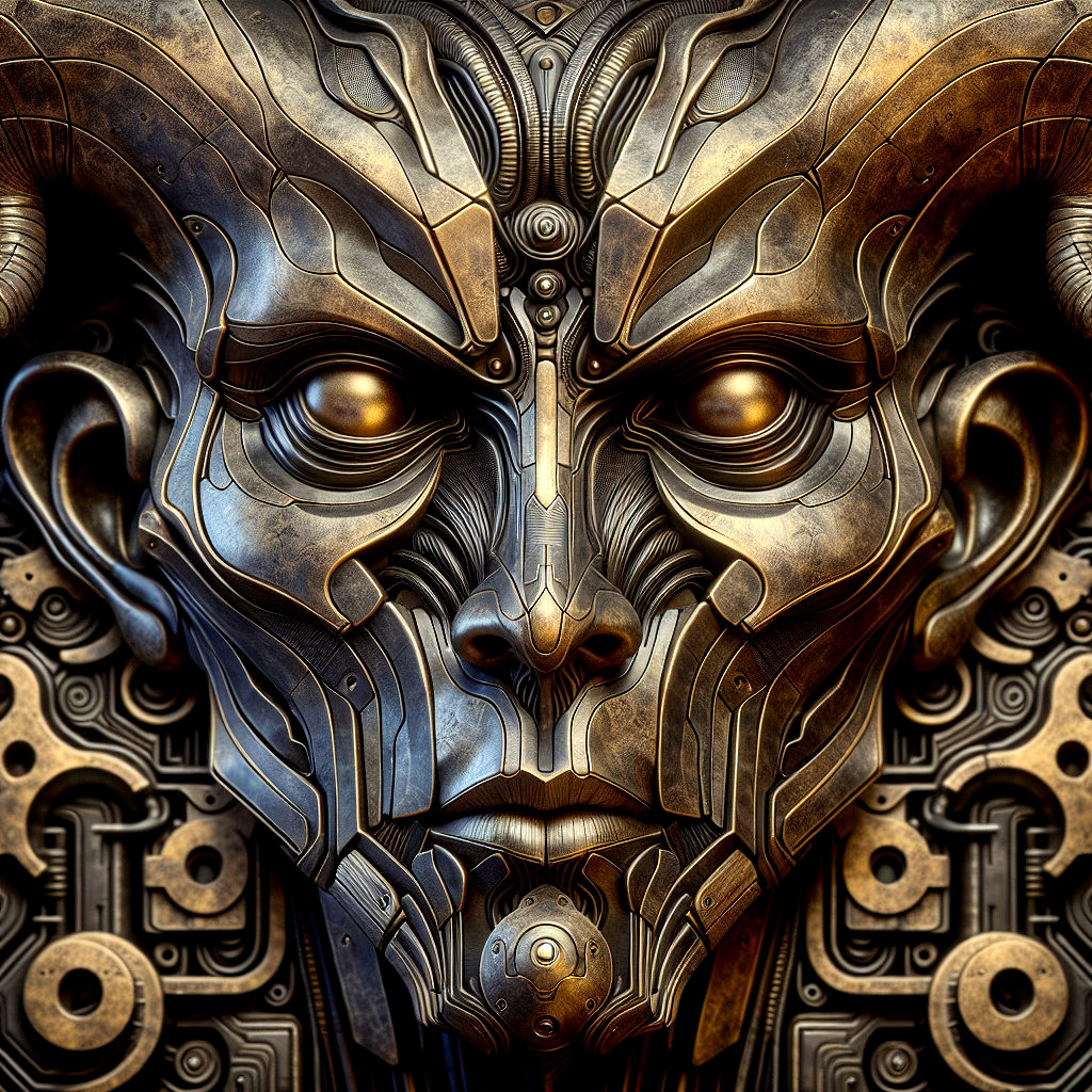 The image features a highly detailed and intricate metallic face, resembling a humanoid robot with horns, adorned with gears and circuitry, evoking a blend of technology and myth.