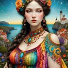 A young woman with long, wavy hair adorned with flowers gazes serenely at the viewer. She wears a vibrant dress with flowing colors, set against a picturesque coastal backdrop with a sailboat.