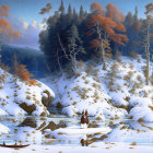 A serene winter landscape features rolling snow-covered hills, dotted with yellow foliage and dark trees against a bright blue sky, while two figures sit quietly nearby, immersed in nature's beauty.