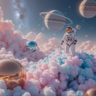 An astronaut stands amidst colorful clouds, surrounded by shimmering planets and celestial bodies. The cosmic scene features a vibrant galaxy in the background, evoking a sense of wonder and exploration.