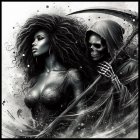 The image features two powerful, warrior-like women with striking features and elaborate hairstyles. They wear intricate armor, wielding ornate weapons against a mystical backdrop.