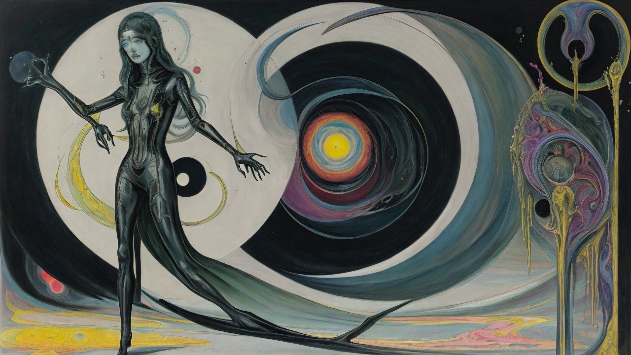 A figure in a sleek black outfit stands against a cosmic backdrop of moons and stars, with ethereal skeletons nearby, evoking a blend of mystique and the surreal.