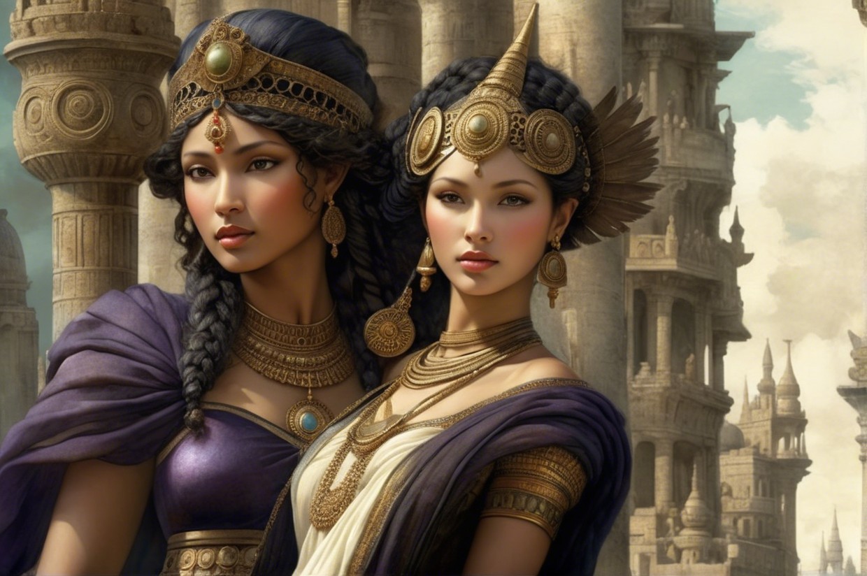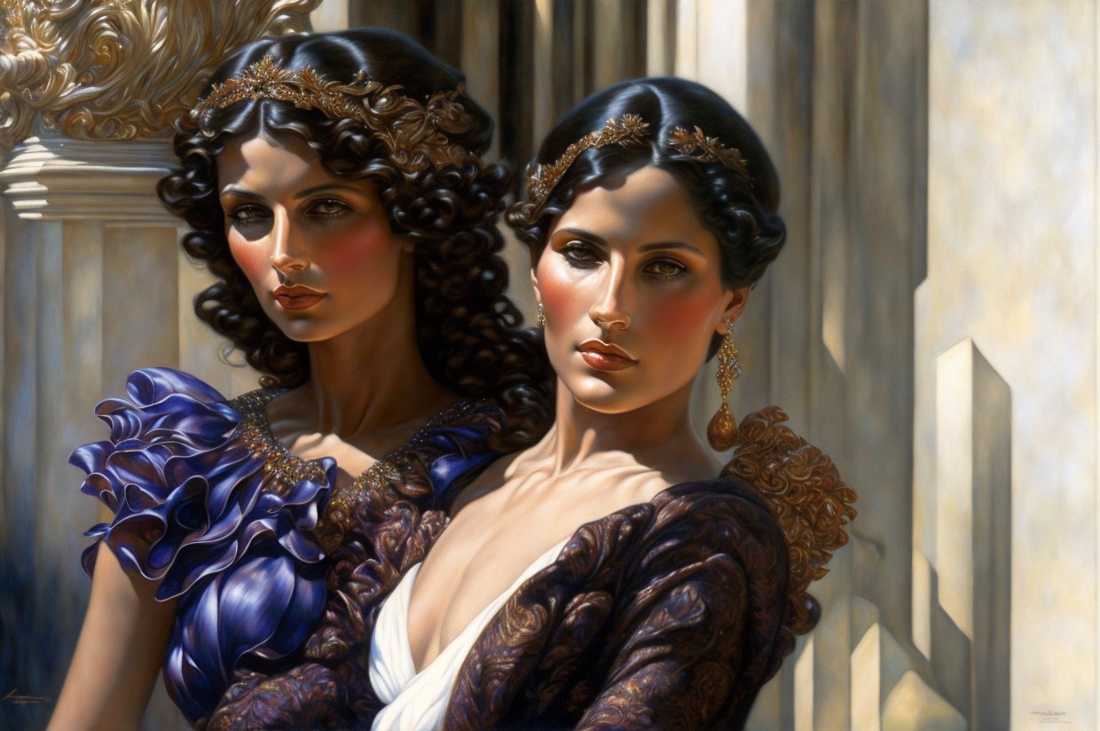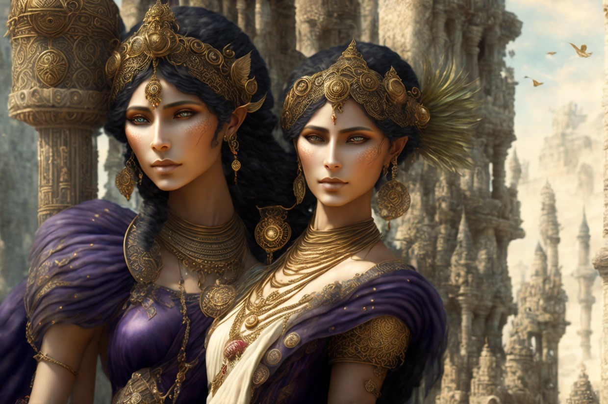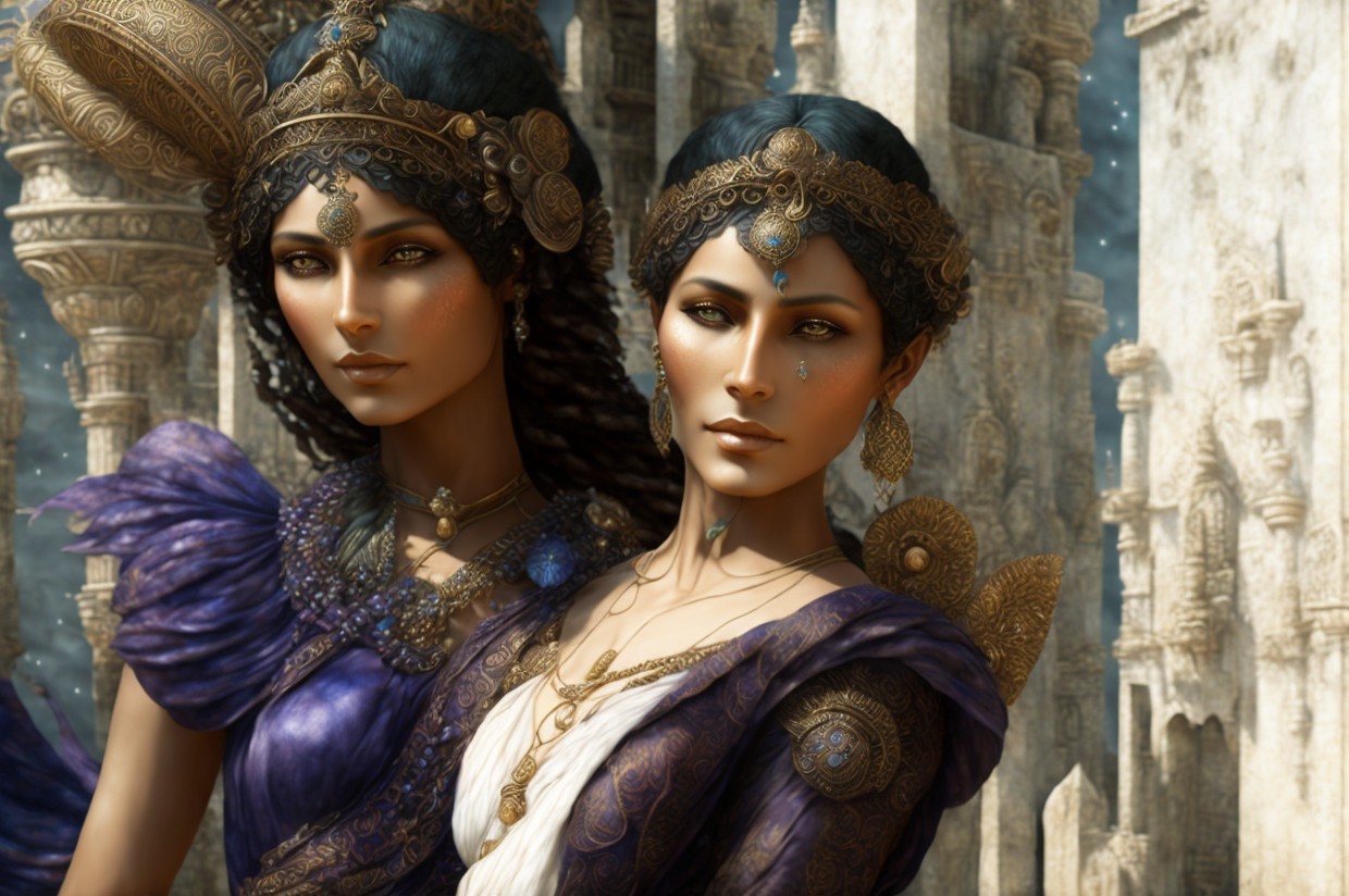 Two elegantly dressed women stand side by side, adorned in intricate jewelry and regal garments. Their striking features and the grand castle in the background evoke a sense of fantasy and sophistication.