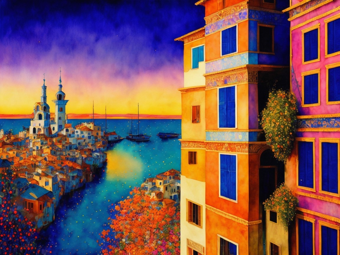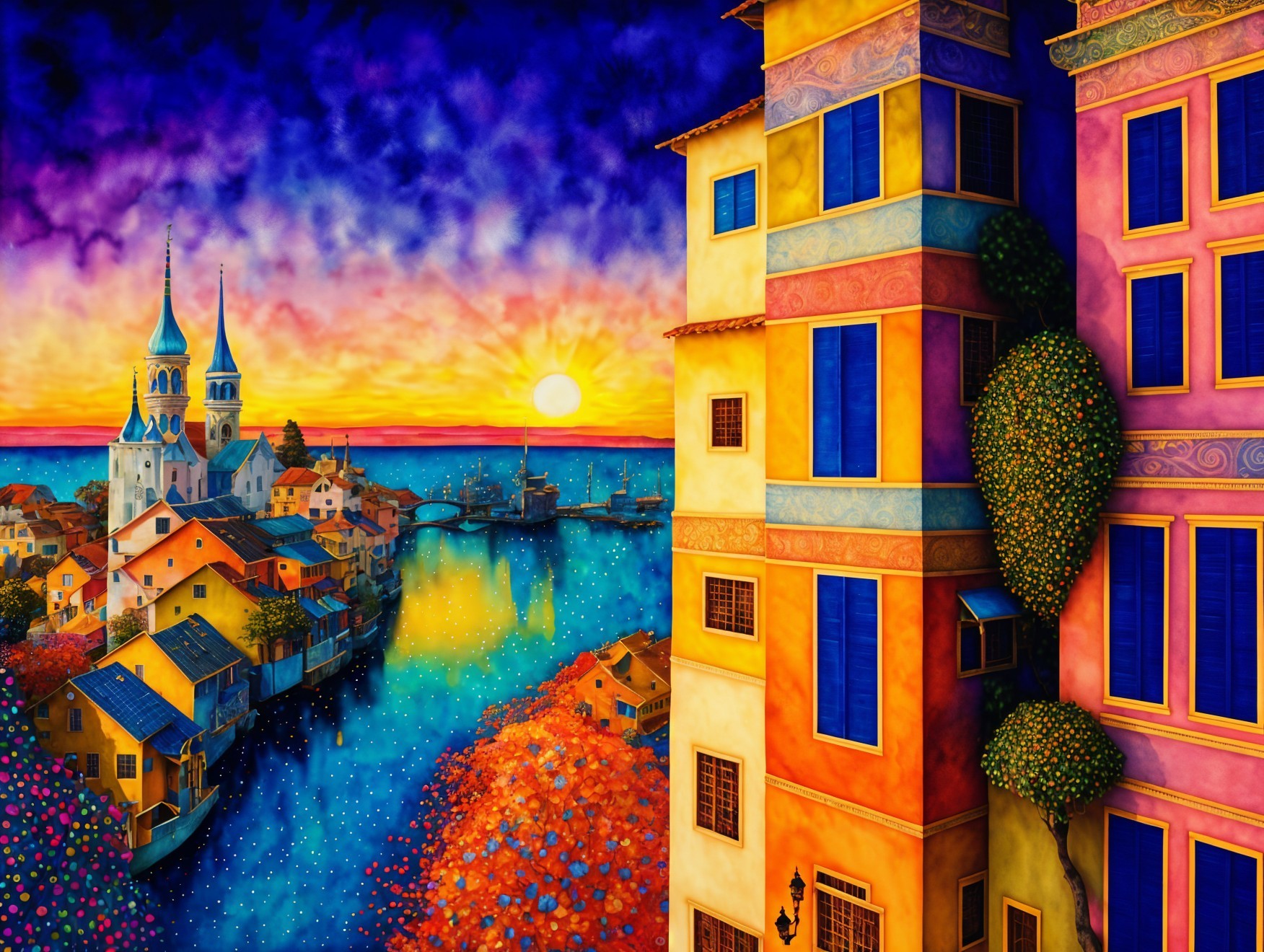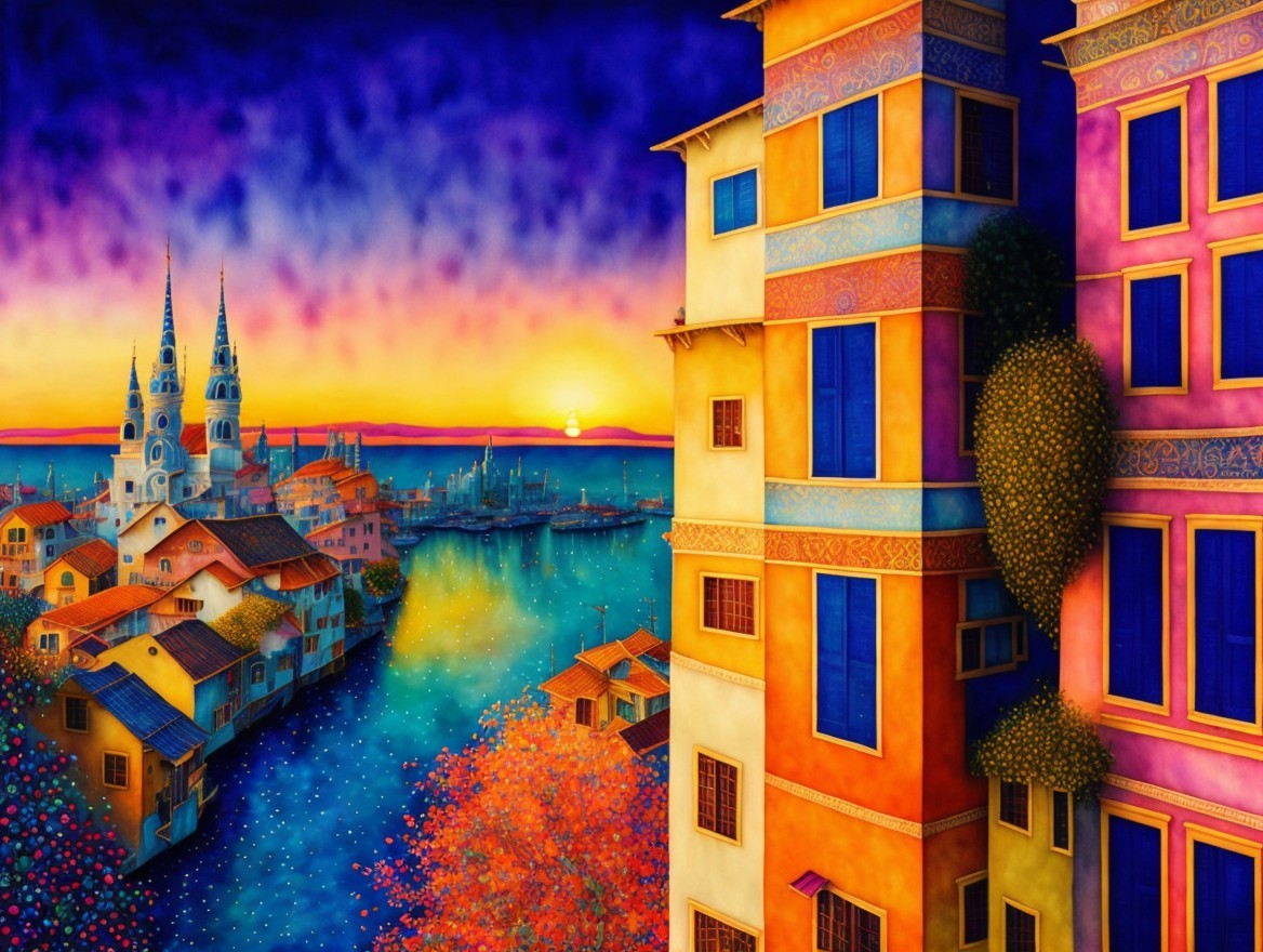 A vibrant, colorful landscape features a sunset over a serene river, with whimsical buildings and trees, reflecting warm hues of orange, blue, and purple, creating a dreamlike atmosphere.