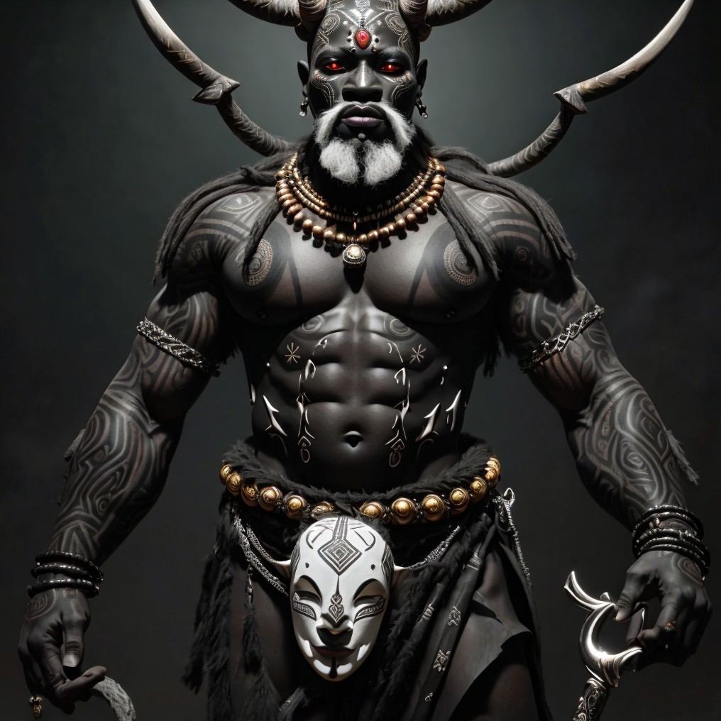 The image depicts a powerful, muscular figure adorned with tribal tattoos and elaborate accessories. Horns and masks enhance a striking presence, evoking themes of strength and cultural significance. His Divine stomach has a face which talks to him