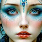 The image features a striking portrait of a woman with bold, colorful makeup highlighting her large blue eyes. The background suggests a blurred, pastoral landscape, adding depth to the scene.